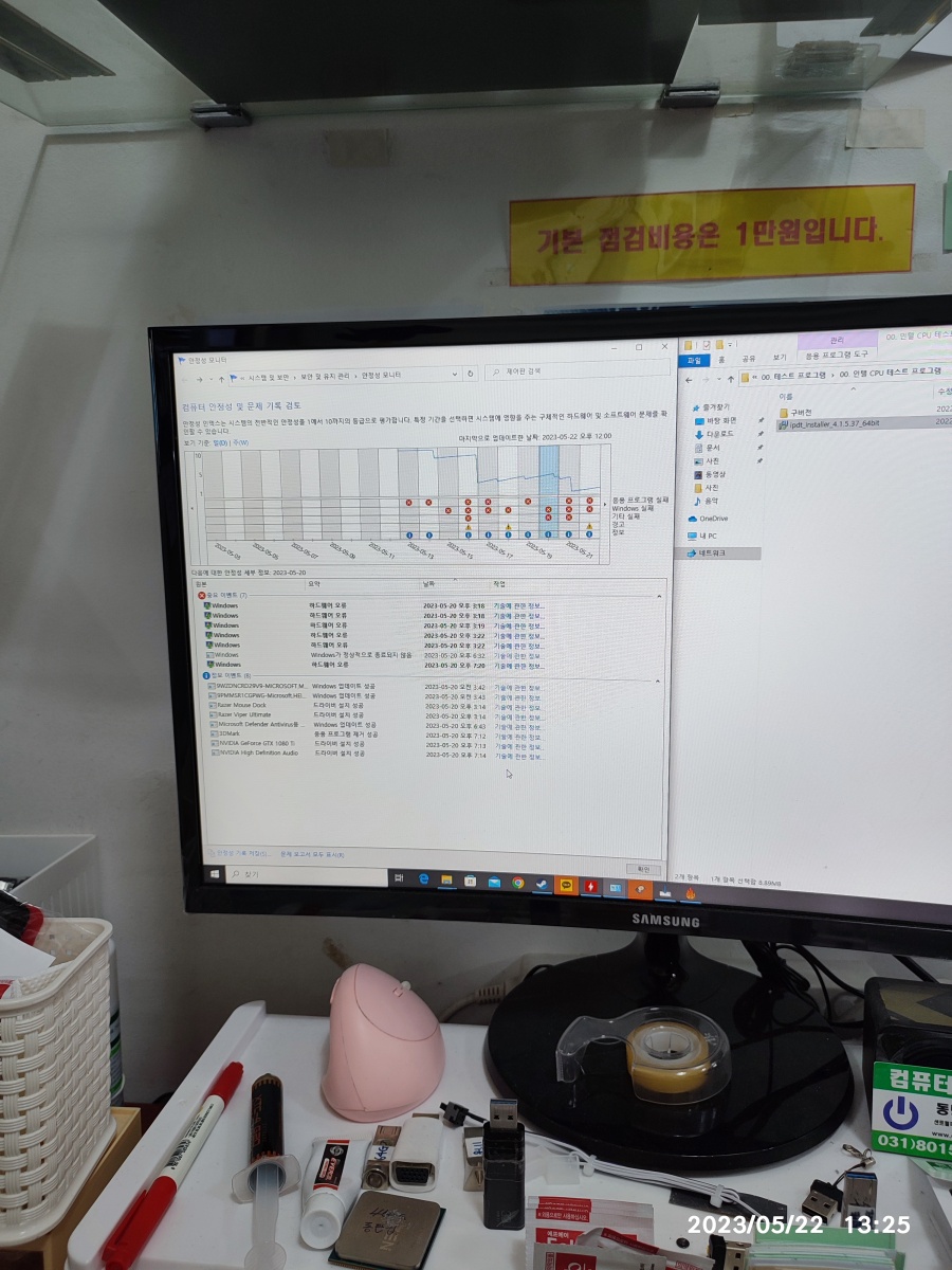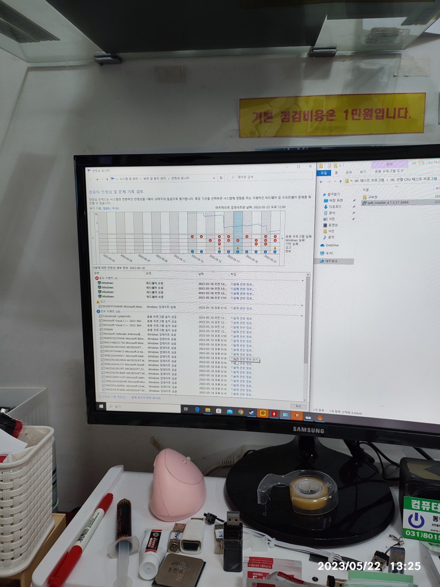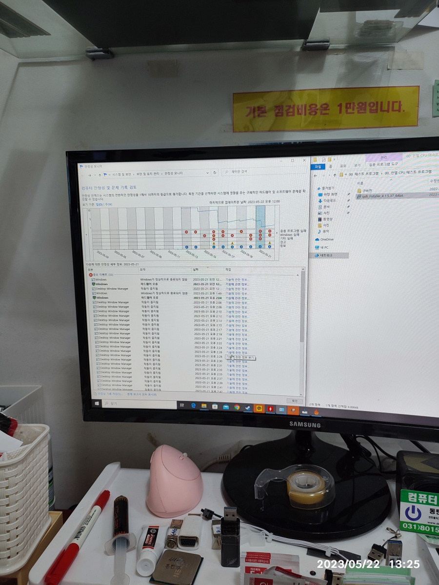 2023년 05월 22일 입고된 컴퓨터입니다. 수리기록은 아니고 컴퓨터를 맡겨 놓으셨다가 맡겨 놓는 게 불안하신지 도로 가져가셨습니다. => 저도 간헐적인 컴퓨터 수리는 별로 반갑지 않습니다. 증상이 일정하게 나타나지 않는 컴퓨터 수리는 힘들어요. 시간이 많이 걸리거든요. 그렇다고 점검 시간이 길다고 수리 비용을 많이 받을 수도 없는 작업이다보니, 일만하고 돈을 못 받는 경우가 생기니깐 고장 증상(튕기는 증상)이 바로 안 나타나면, 입고 자체를 잘 안 받고 있습니다.