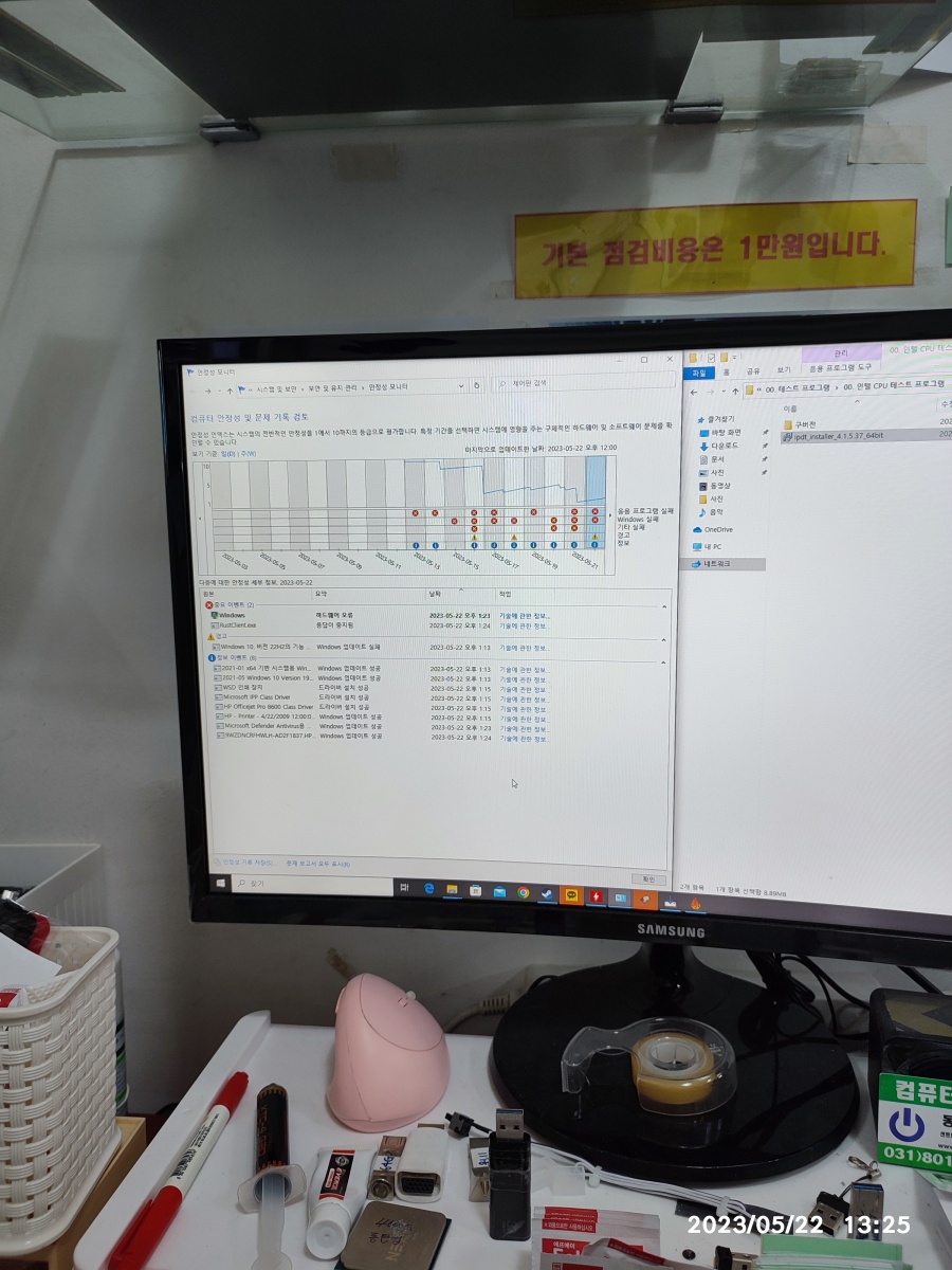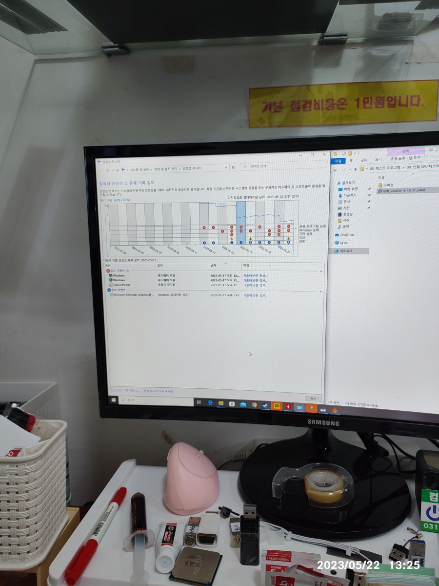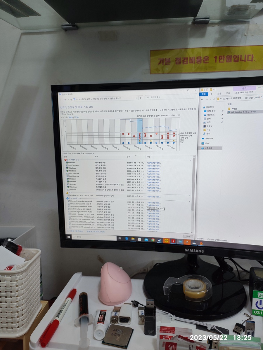 2023년 05월 22일 입고된 컴퓨터입니다. 수리기록은 아니고 컴퓨터를 맡겨 놓으셨다가 맡겨 놓는 게 불안하신지 도로 가져가셨습니다. => 저도 간헐적인 컴퓨터 수리는 별로 반갑지 않습니다. 증상이 일정하게 나타나지 않는 컴퓨터 수리는 힘들어요. 시간이 많이 걸리거든요. 그렇다고 점검 시간이 길다고 수리 비용을 많이 받을 수도 없는 작업이다보니, 일만하고 돈을 못 받는 경우가 생기니깐 고장 증상(튕기는 증상)이 바로 안 나타나면, 입고 자체를 잘 안 받고 있습니다.