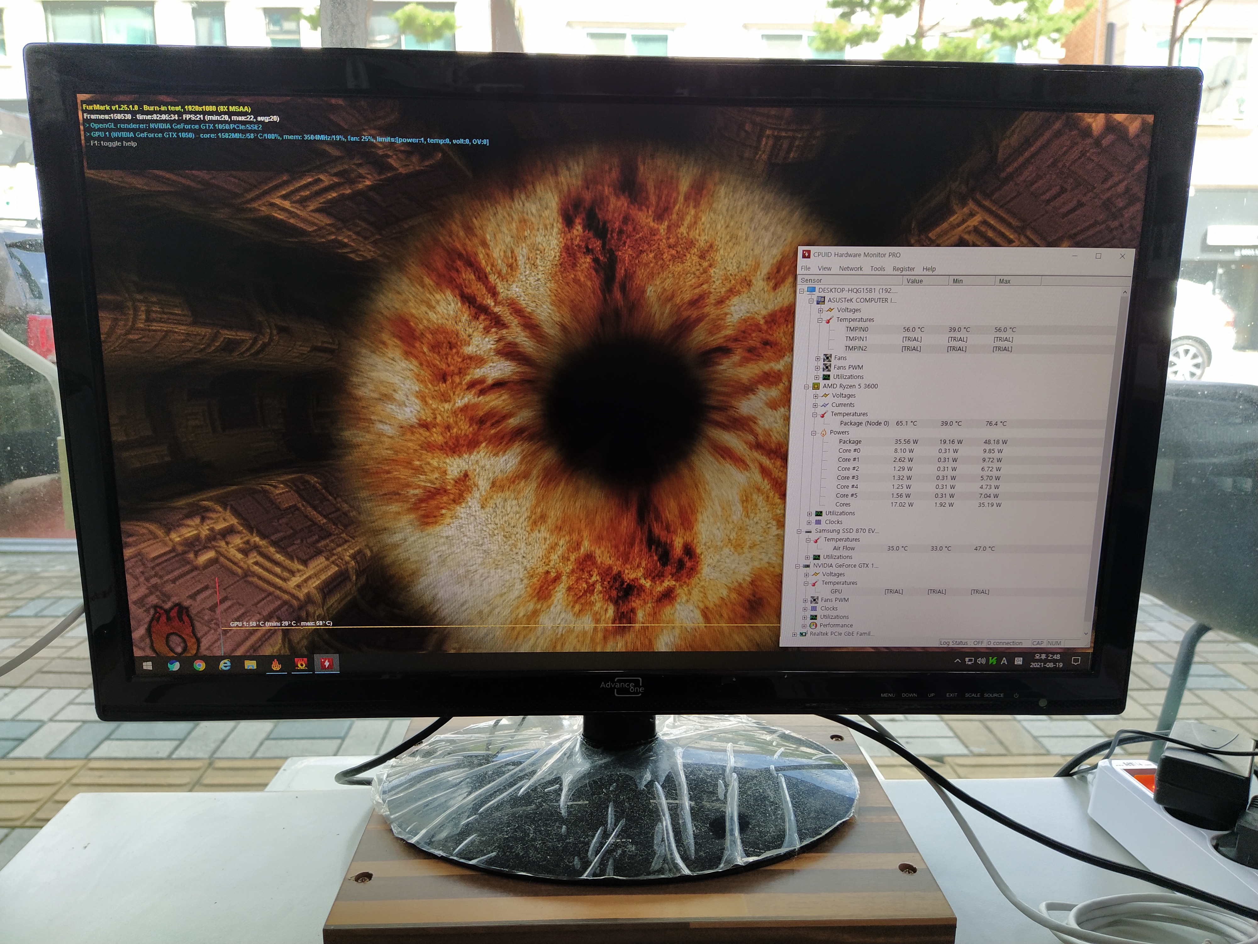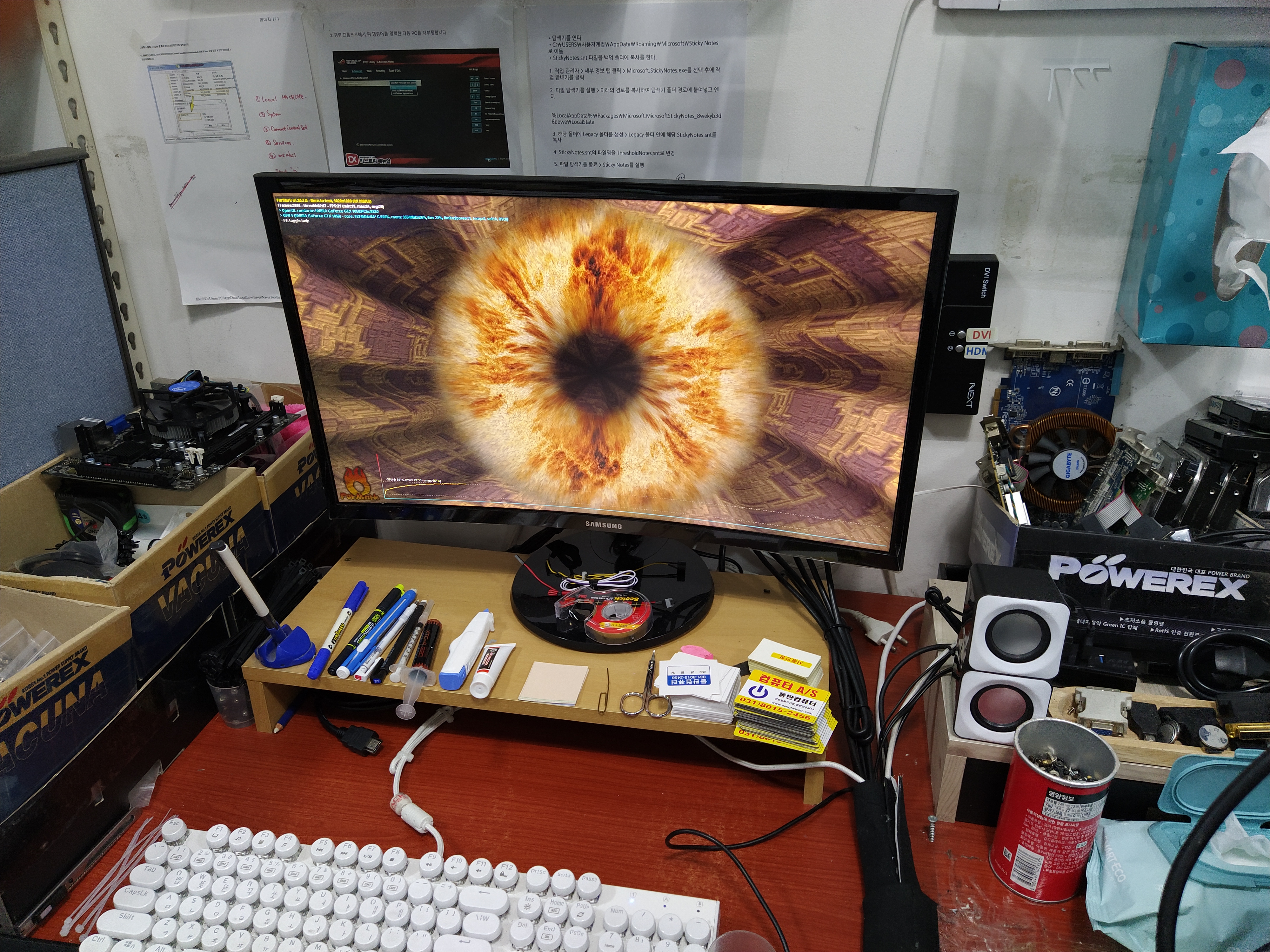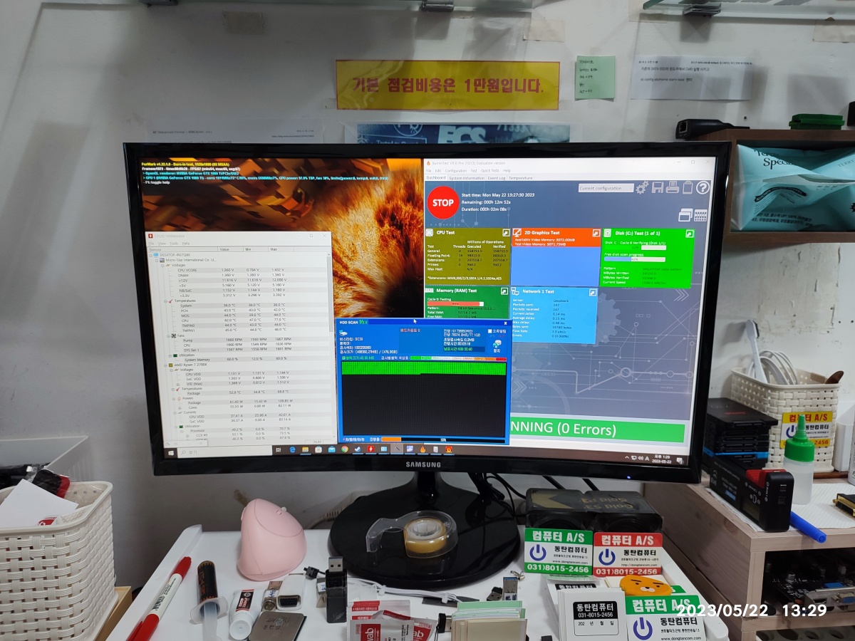 이틀에 걸쳐서 그래픽카드 부분에 중점을 둬서 테스트를 진행했습니다. 게이밍 그래픽 화면을 계속 돌려서 발열체크와 화면 정상 출력 여부를 확인하고 있습니다.