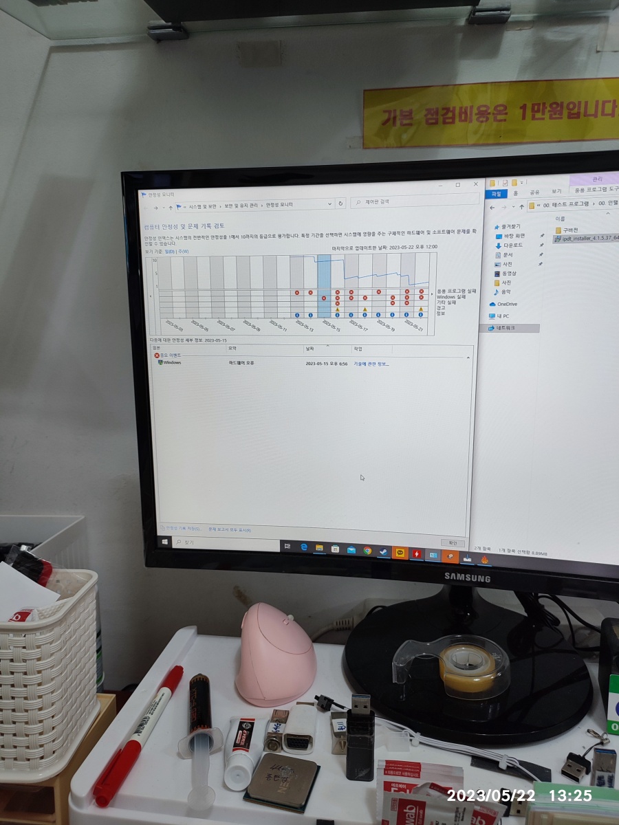 2023년 05월 22일 입고된 컴퓨터입니다. 수리기록은 아니고 컴퓨터를 맡겨 놓으셨다가 맡겨 놓는 게 불안하신지 도로 가져가셨습니다. => 저도 간헐적인 컴퓨터 수리는 별로 반갑지 않습니다. 증상이 일정하게 나타나지 않는 컴퓨터 수리는 힘들어요. 시간이 많이 걸리거든요. 그렇다고 점검 시간이 길다고 수리 비용을 많이 받을 수도 없는 작업이다보니, 일만하고 돈을 못 받는 경우가 생기니깐 고장 증상(튕기는 증상)이 바로 안 나타나면, 입고 자체를 잘 안 받고 있습니다.