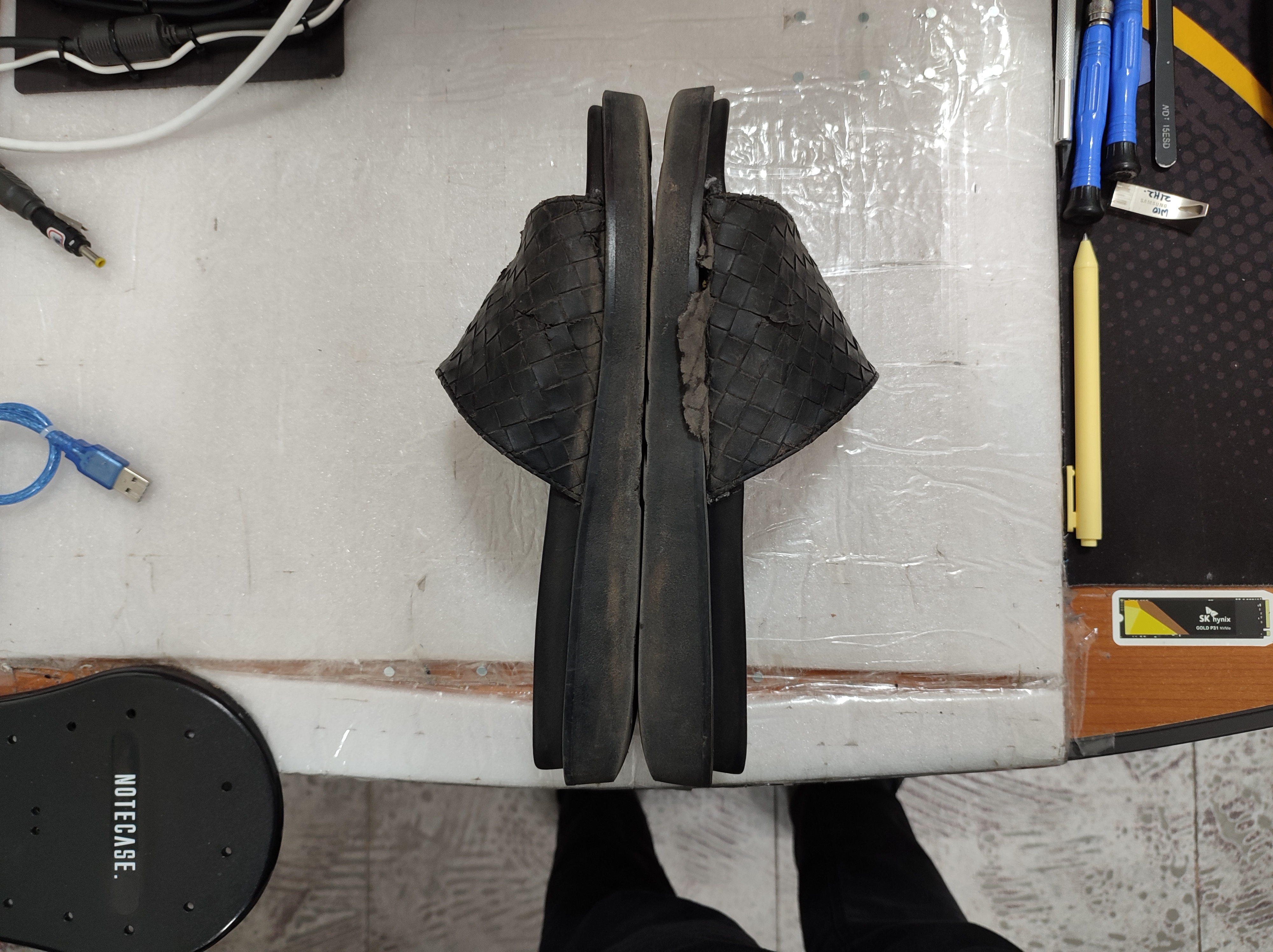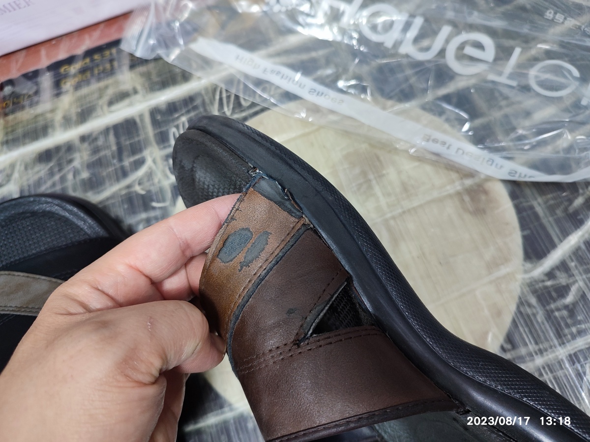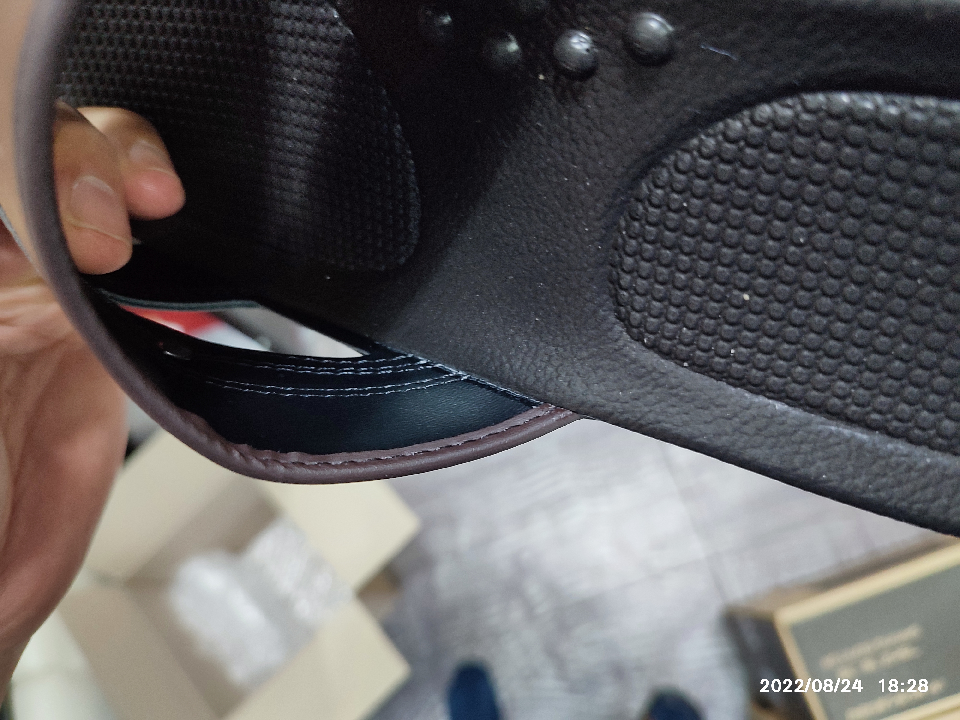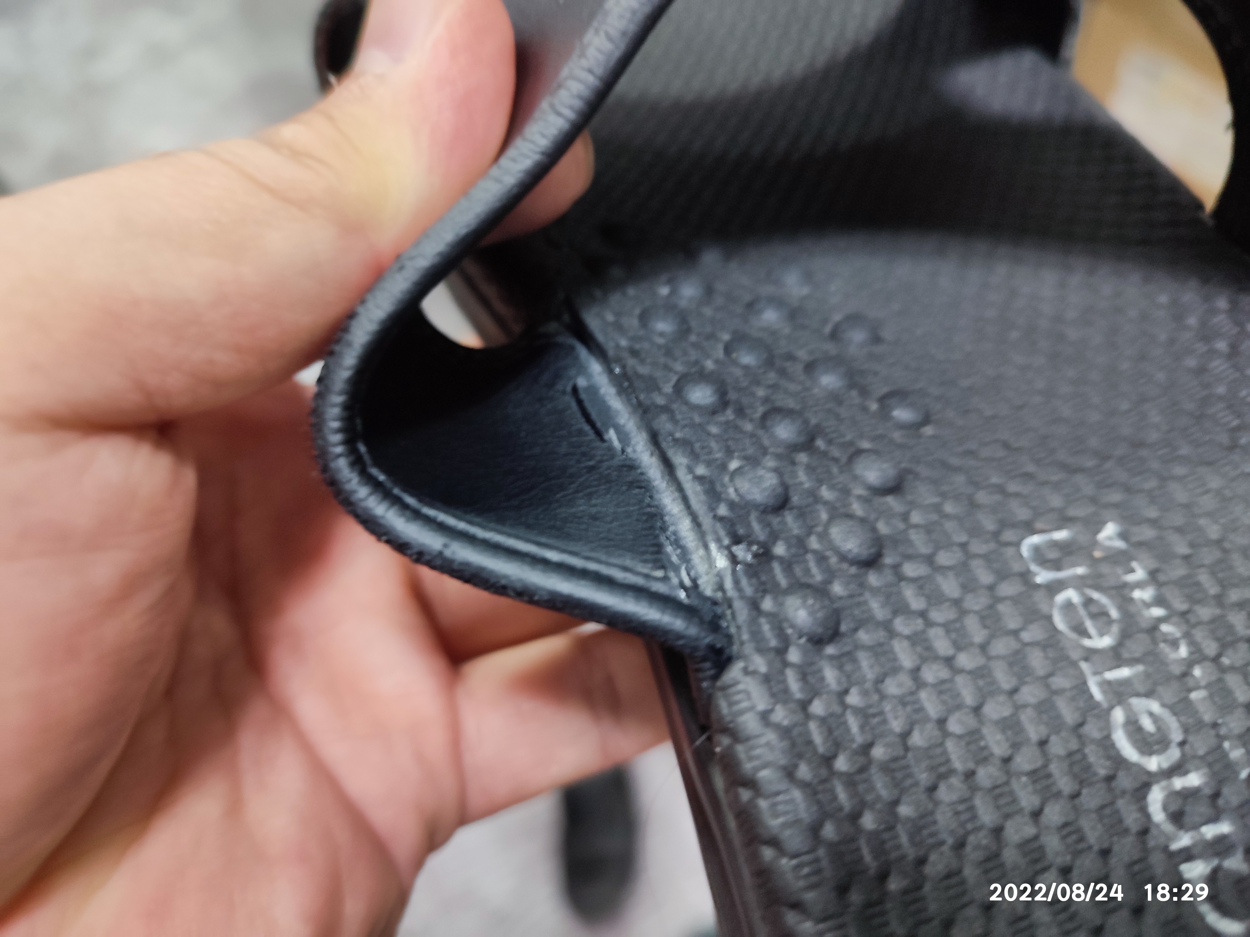 아래와 같이 슬리퍼 가죽을 잡아주는 부분이 조금 떨어져서, (완전 뽑힌 건 아니고) 순간접착제로 붙여놓은 상태입니다. 접착제로 붙여놓은 부분이 떨어지면, 슬리퍼가 헐거워서 슬리퍼와 양말이 미끄러집니다. 슬리퍼가 미끄러워서 슬리퍼가 돌아갈 수 있으니깐, 접착제로 붙여서 신으면 될 거 같습니다. (피혁을 붙일 수 있는 본드가 별도로 있을 거 같기는 한데, 저는 그냥 순간접착제로 붙였어요.)