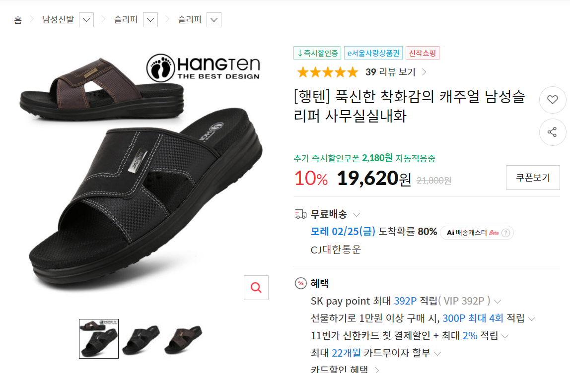 [ 2022년 02월 23일 ] [행텐] 푹신한 착화감의 캐주얼 남성슬리퍼 사무실실내화