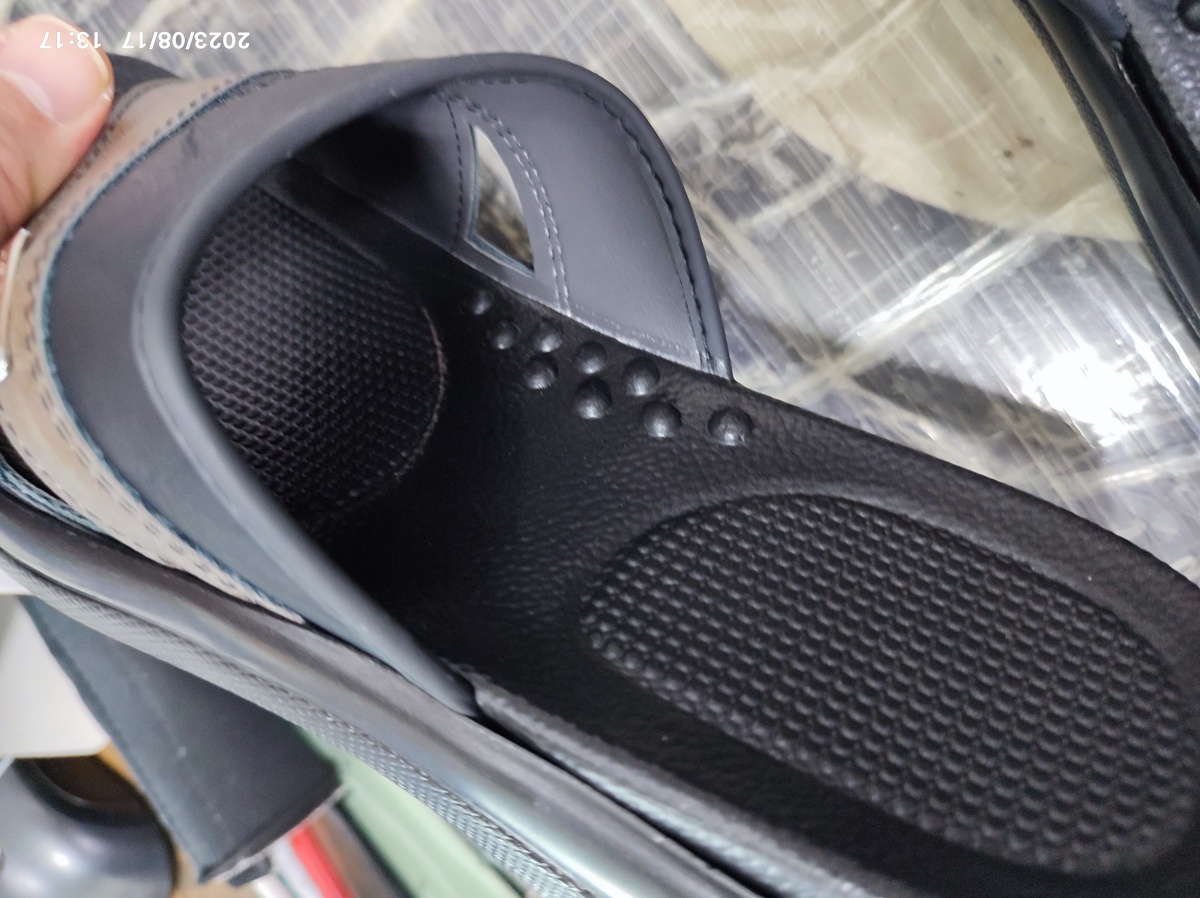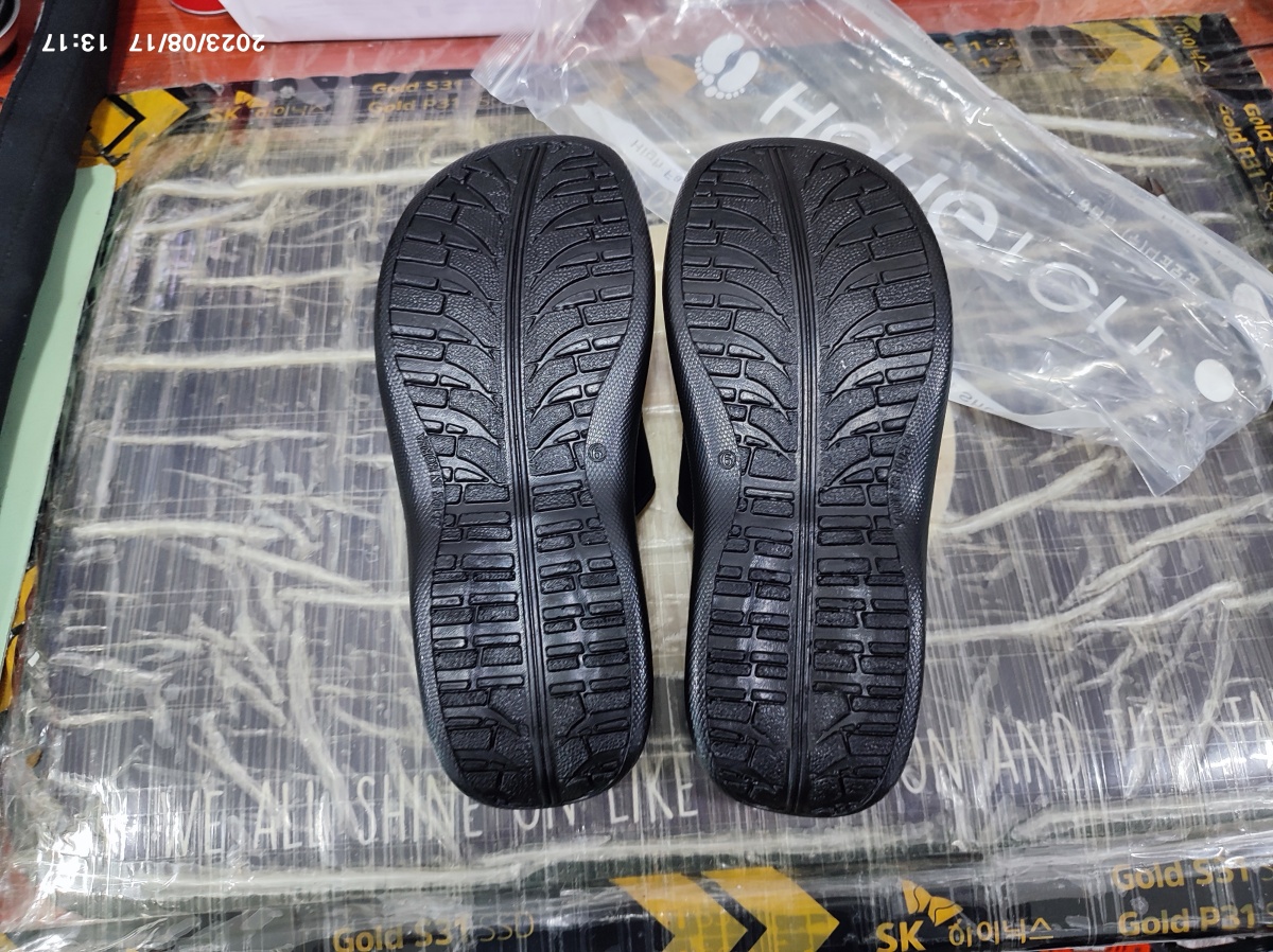 정사이즈로 나와서 발 사이즈는 딱 맞았는데요. 뒤꿈치에 슬리퍼 벗겨지지 않도록 잡아주는 단이 있는데, 신발 구겨 신는 느낌이 나기도 합니다. 뒤꿈치를 확실히 잡아주는 느낌은 아닙니다. 헐거운 느낌이 없지 않네요.