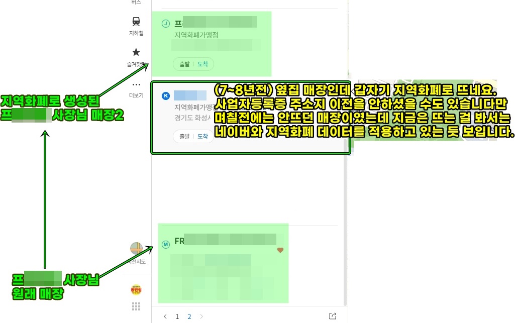 갑자기 7~8년전에 계시던 옆집 사장님 매장이 지역화폐 가맹점으로 뜨네요. 이전하고 사업장 주소지(사업자등록증)를 변경하지 않으셨던 것인지? 갑자기 뜨기 시작했습니다. 네이버지도에서는 삭제된 플레이스였는데 다시 데이터가 살아났습니다. (플레이스 안쪽에는 아무런 데이터가 없는 기본플레이스 정보가 뜨기는 합니다.) 또는 프XXX사장님의 매장은 새로운 지역화폐 매장이 뜨기 시작했는데요. 영문는 기존의 플레이스이고 한글은 경기지역화폐에 등록된 상호명으로 보입니다. 이 부분만 보더라도 대량의 데이터를 처리하는 과정에서 오류가 생긴 것이 아닐까 생각해 봅니다. 아직 정식적으로 공지가 올라온 것은 아니라서 더 자세한 내막을 알기는 어렵겠습니다만 온오프라인의 정보가 잘 맞춰질 수 있기를 바랍니다. 또한, 관리자와 소통할 수 있는 창구가 있으면 좋을 거 같습니다. 관리자와 연락하는게 정말 쉽지 않는 부분인 거 같습니다. (네이버지도보다는 카카오지도 수정하는 과정이 수월합니다.)
