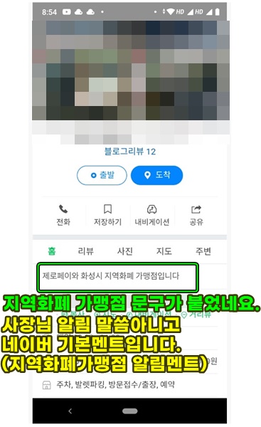 아래와 같이 네이버 스마트플레이스 페이지에 "지역화폐"가맹점 알림 문구가 붙었습니다. 사장님이 직접 쓰는 알림 멘트 아니고 네이버에서 "경기지역화폐 가맹점 데이터 베이스"와 네이버 지도 플레이스를 동기화한 것으로 보입니다. (사용자가 수정할 수 없는 네이버 지도의 기본 안내 멘트입니다. 사장님은 사장님 알림-공지 말씀을 통해서 적으셔야할 거 같습니다.)