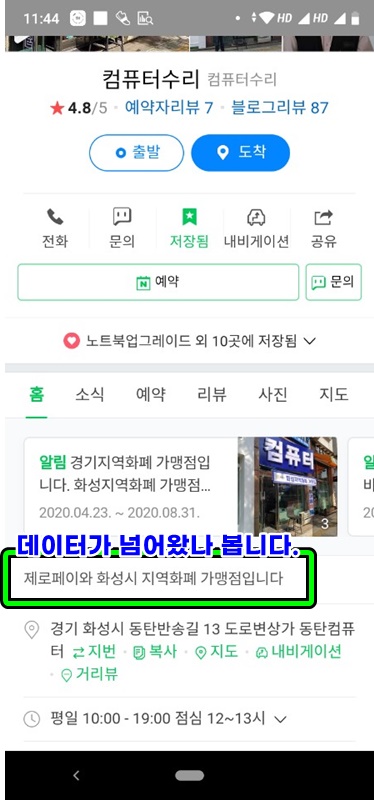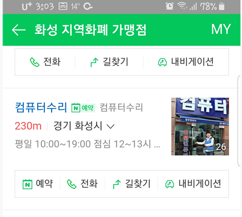 하지만, 네이버지도, 카카오지도를 통해서 "지역화폐"를 검색해봤을 때는 누락된 곳이 많습니다. 저 역시도 누락된 상태로 나왔습니다. 하지만 오프라인 매장에서 정상적으로 "지역화폐" 사용 가능한 화성동탄에 있는 컴퓨터매장입니다. 행복화성지역화폐카드와 경기도+화성시 긴급재난지원금(재난기본소득)을 받으신 신용카드로 정상적으로 잘 결제하고 계시지만, 네이버와 카카오지도에서는 가맹점 표기가 안뜨고 있습니다. 누락되는 매장을 보고 있으면 공통점을 찾아보기가 어려울 정도로 중구난방으로 누락되어 있는 상태라서 전체적으로 어떤 문제가 있는지 추측하기는 어려운 상태입니다.