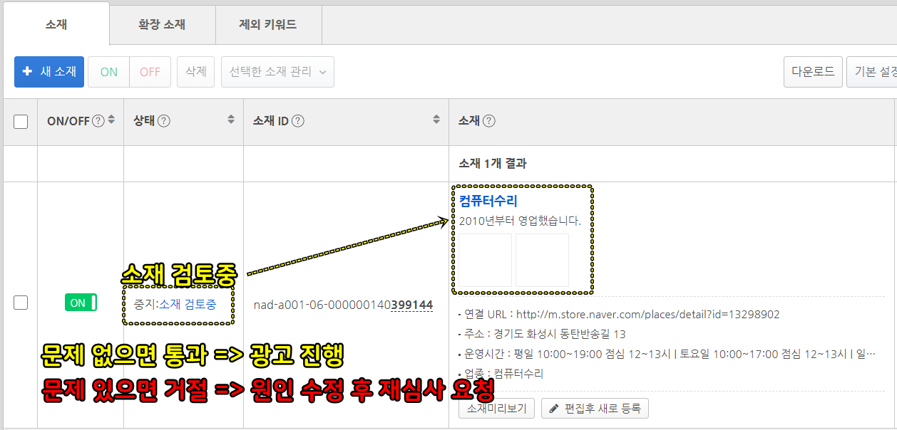 6-4. 소재 검토를 받습니다. 통과되면, 광고 진행하는 것이고 소재가 불량이면, 거절됩니다.