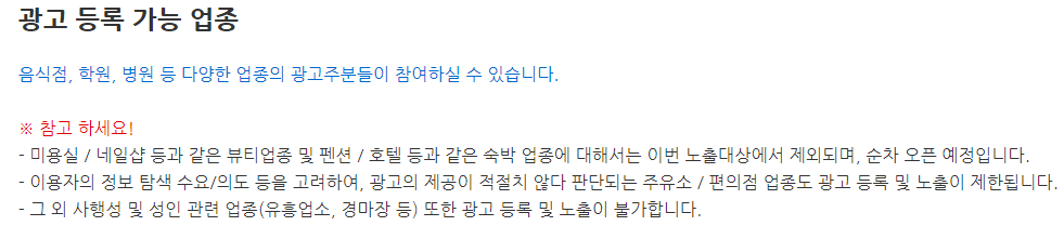 미용실/네일샵 뷰티업종 및 펜션 / 호텔 숙박업종 => 이번 노출 대상 제외 => 다음에 시행 준비 중