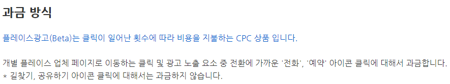특이한 점은 클릭만으로 과금되는 시스템은 아니고, 전화 버튼을 누르거나, 예약, 주문 버튼을 눌렀을 때, 과금되는 방식이라는 점인데요. 그나마 다행이라고 생각합니다. 아무거나 클릭했는데 돈이 빠져나가면, 경쟁 업체에서도 마구 눌러서 광고료를 소진시킬 수 있기 때문에 경쟁 광고주끼리 서로 서로 누르고 앉아 있는 진풍경을 볼 수 있습니다. (광고대행업체도 크게 다르지 않을 거라 생각합니다.)