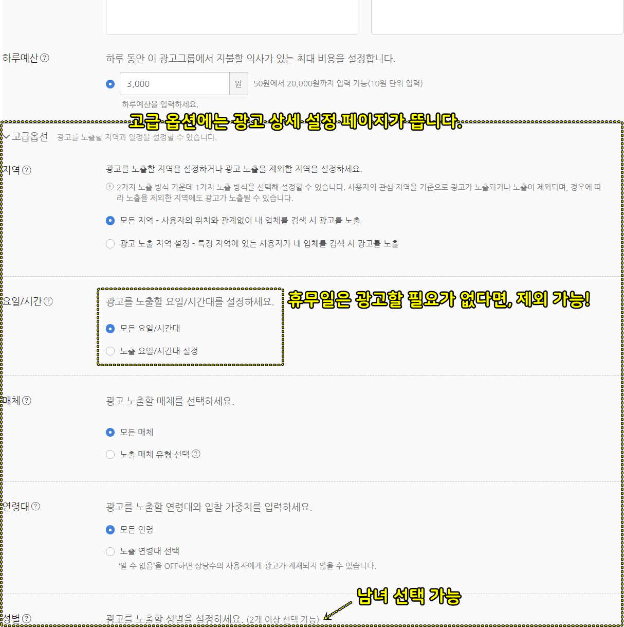 저도 그룹 만들고 쓰는 기능은 일일 예산, 노출지역, 노출 성별 등만 사용하고 있습니다.