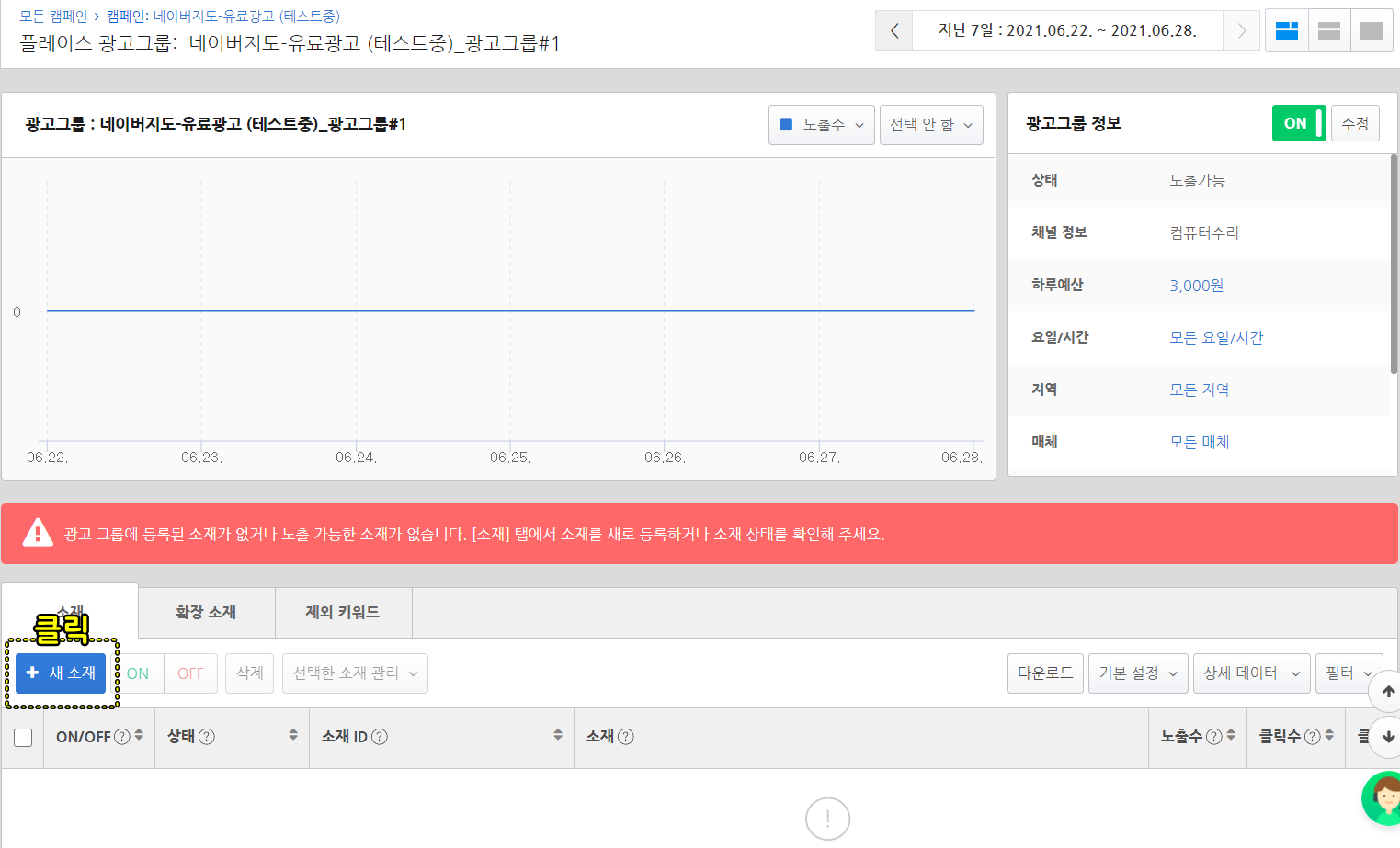 6-1. 광고그룹을 클릭해서 들어갑니다. 새 소재 클릭