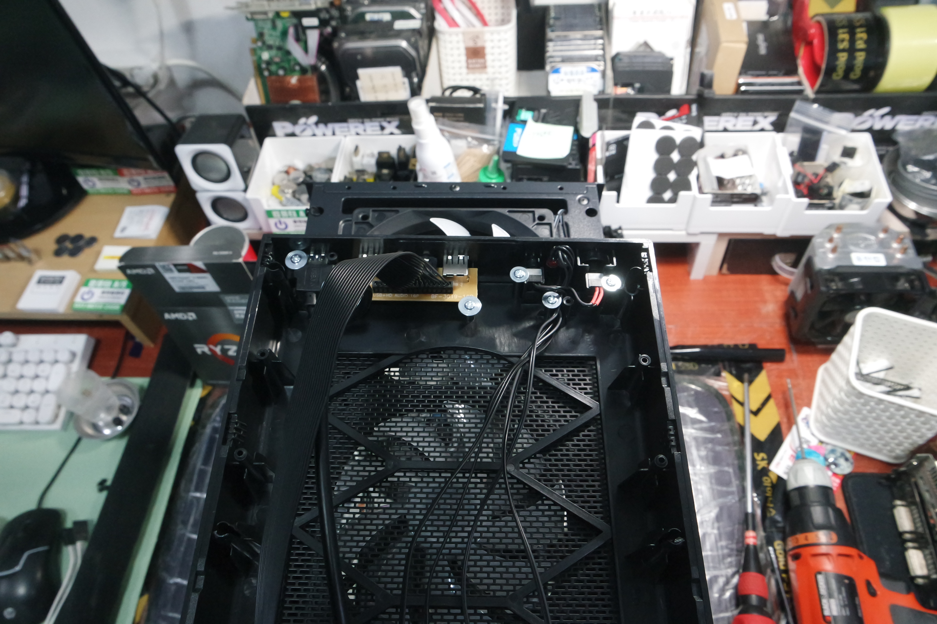 전면 베젤에 연결된 케이블을 당겨지면, 뽑을 위험이 있는 부분이라서 사진을 찍어둔 거 같아요. 전원/리셋 스위치의 케이블을 한 번 더 나사로 고정해뒀네요. 전면 USB 포트와 사운드포트는 기판으로 연결된 모습입니다.