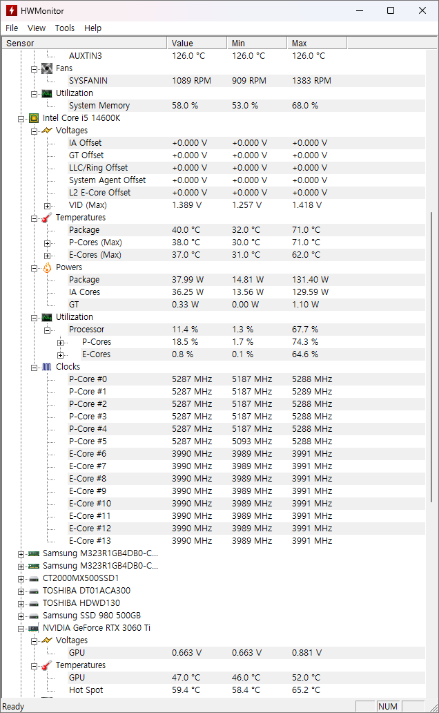 2024년 03월 19일 하루 종일 HWMonitor 프로그램을 띄워뒀습니다.