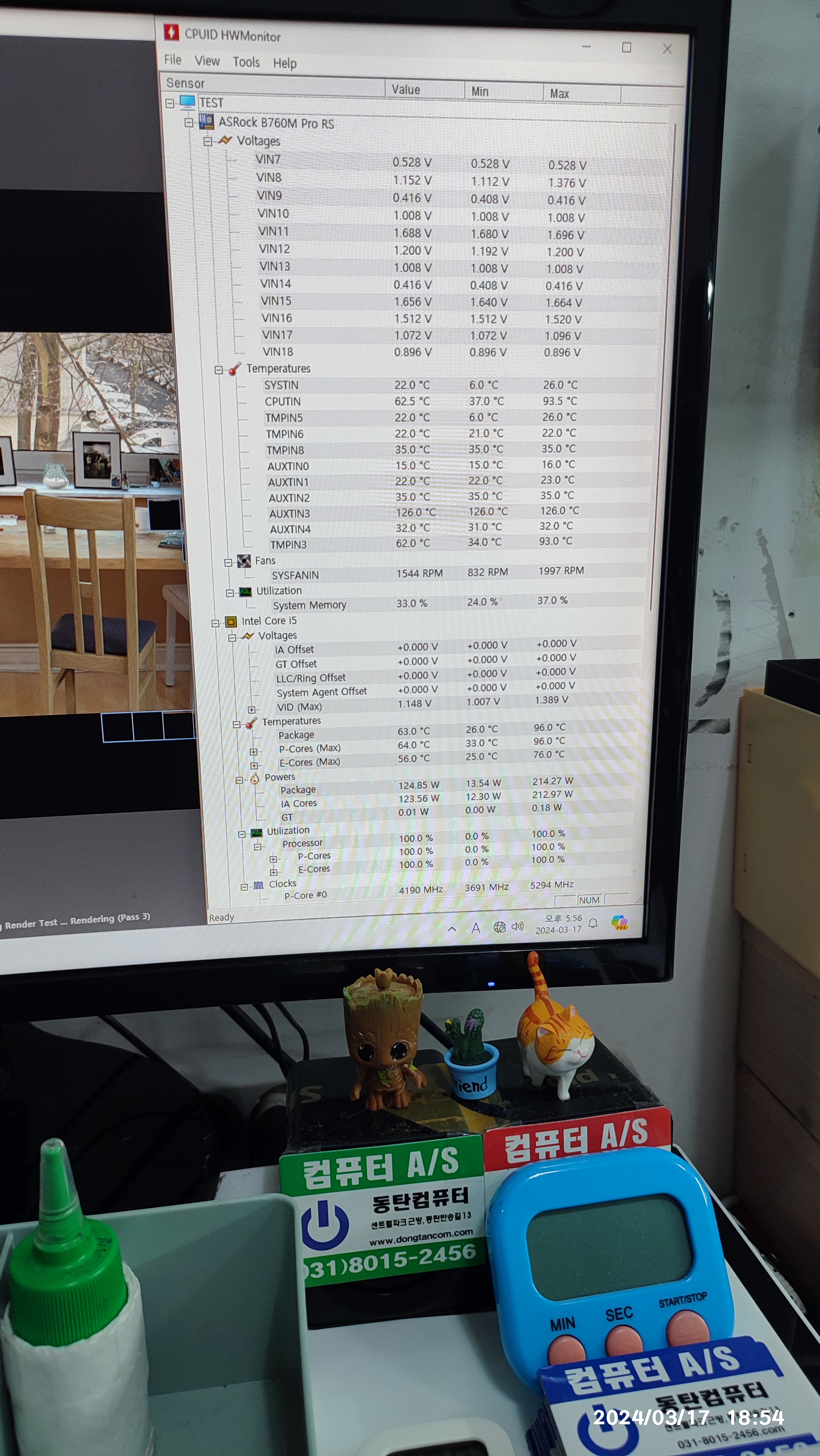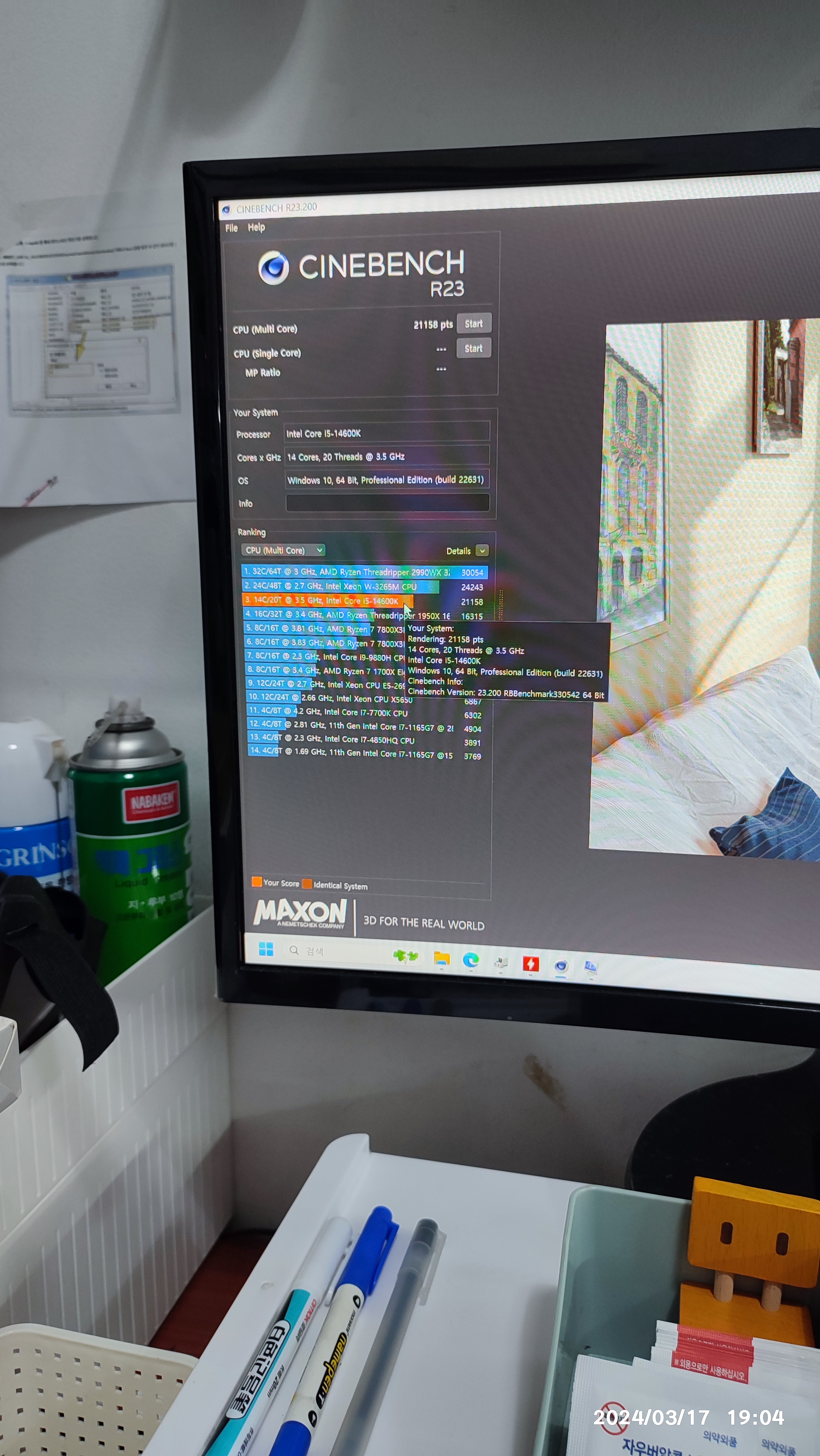 시네벤치 R23 돌려보고 있습니다. CPU 최대 온도는 96도가 찍히네요. (CPU 사용 전력이 높을 때 214W) CPU 멀티 점수는 21158점 나왔습니다. (인터넷에서 찾아보니 25,000점 정도 나오네요.) 처음에 CPU 전력이 200W 넘게 나오다가 (온도 90도대) 중간에 100W~ 정도로 떨어지고 (온도 60도대) 안 올라가네요. 메인보드에서 CPU 전력 사용량 관련 설정을 만져봐야 겠지만, 그냥 이대로 사용해도 일반 사무용으로는 차고 넘치는 CPU입니다. 빠릿빠릿하니 좋네요.