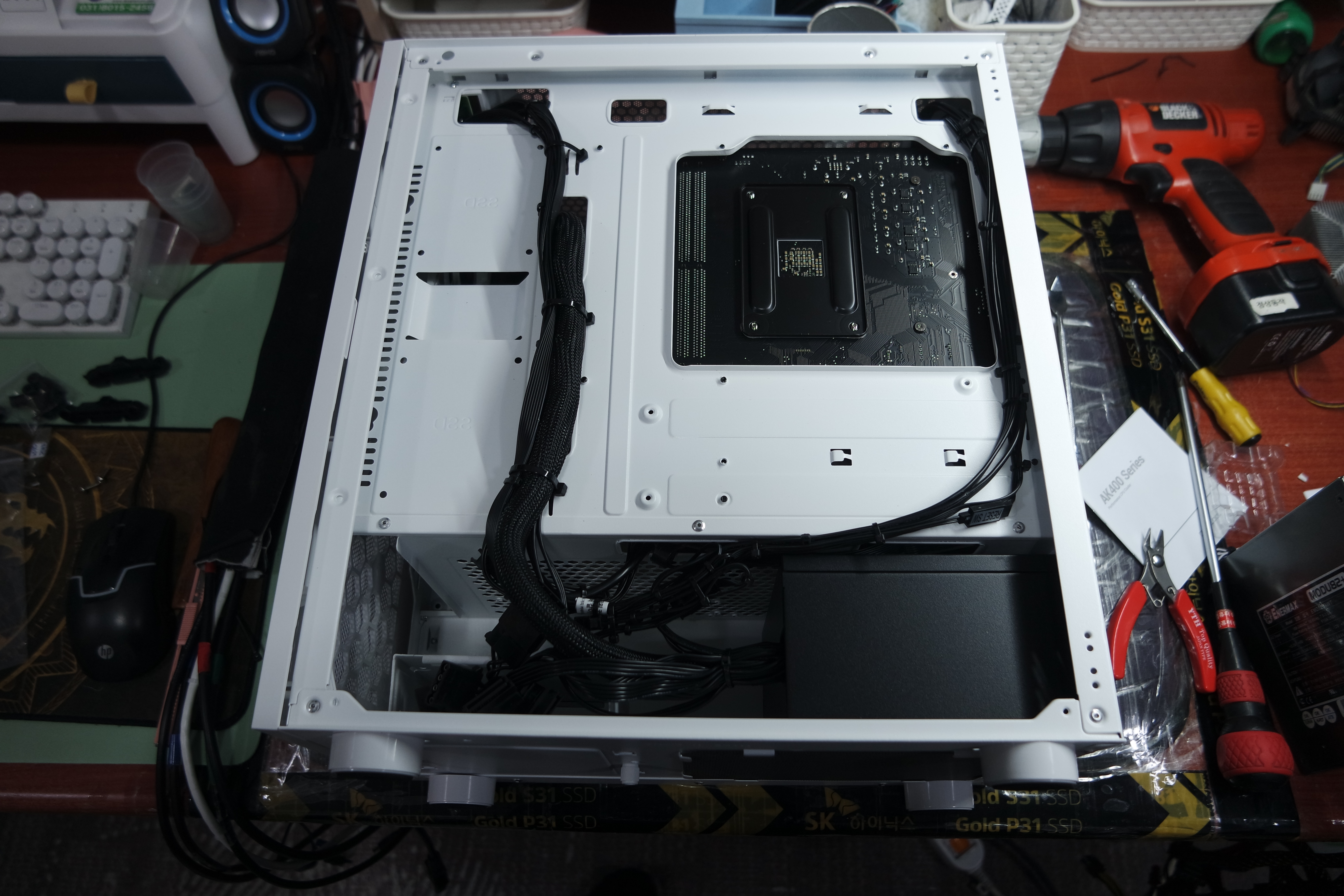 DLM21 RGB 케이스 후면 선정리 방향입니다. 각자의 방법대로 정리하셔도 되지만, 저는 이렇게 후면팬의 전원선을 CPU 보조 전원과 묶고 파워서플라이 옆에 공간에서 선정리를 했습니다.