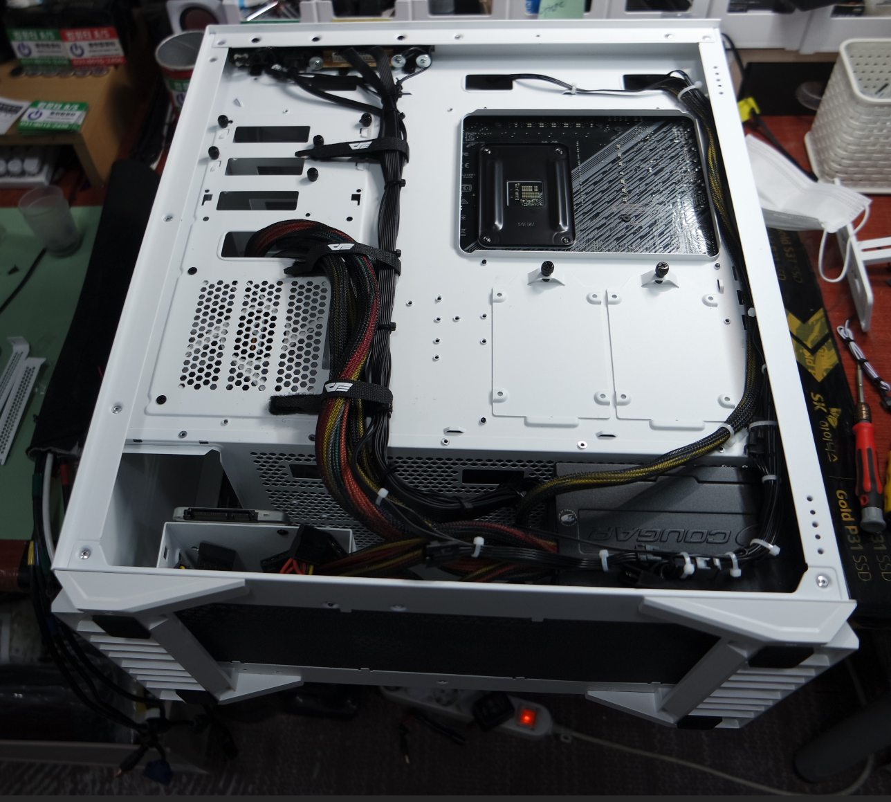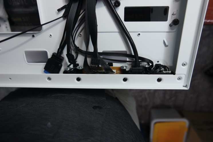 뒤면 케이블 정리는 작업 중간에 찍어둔 사진 밖에 없네요. 아직 사타 케이블은 연결되지 않은 상태입니다. 좌측 라인과 우측 라인으로 선정리를 했습니다. 공간이 넓은 케이스라서 어떤 방향으로 정리해도 뚜껑은 잘 닫힐 거 같습니다. 케이블 타이 색상을 팬은 흰색으로 구분하고 전면 패널선은 검은색으로 정리했습니다.