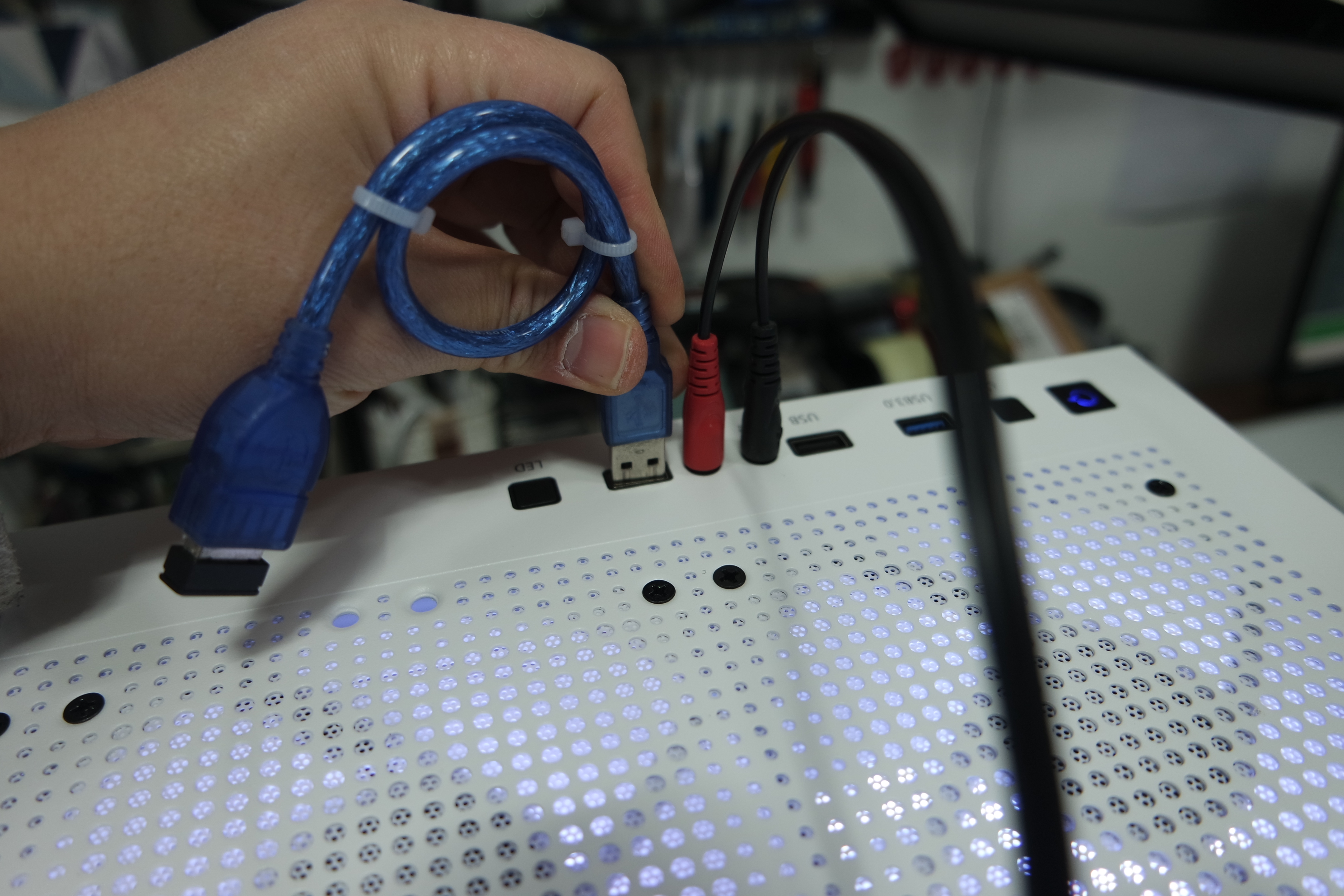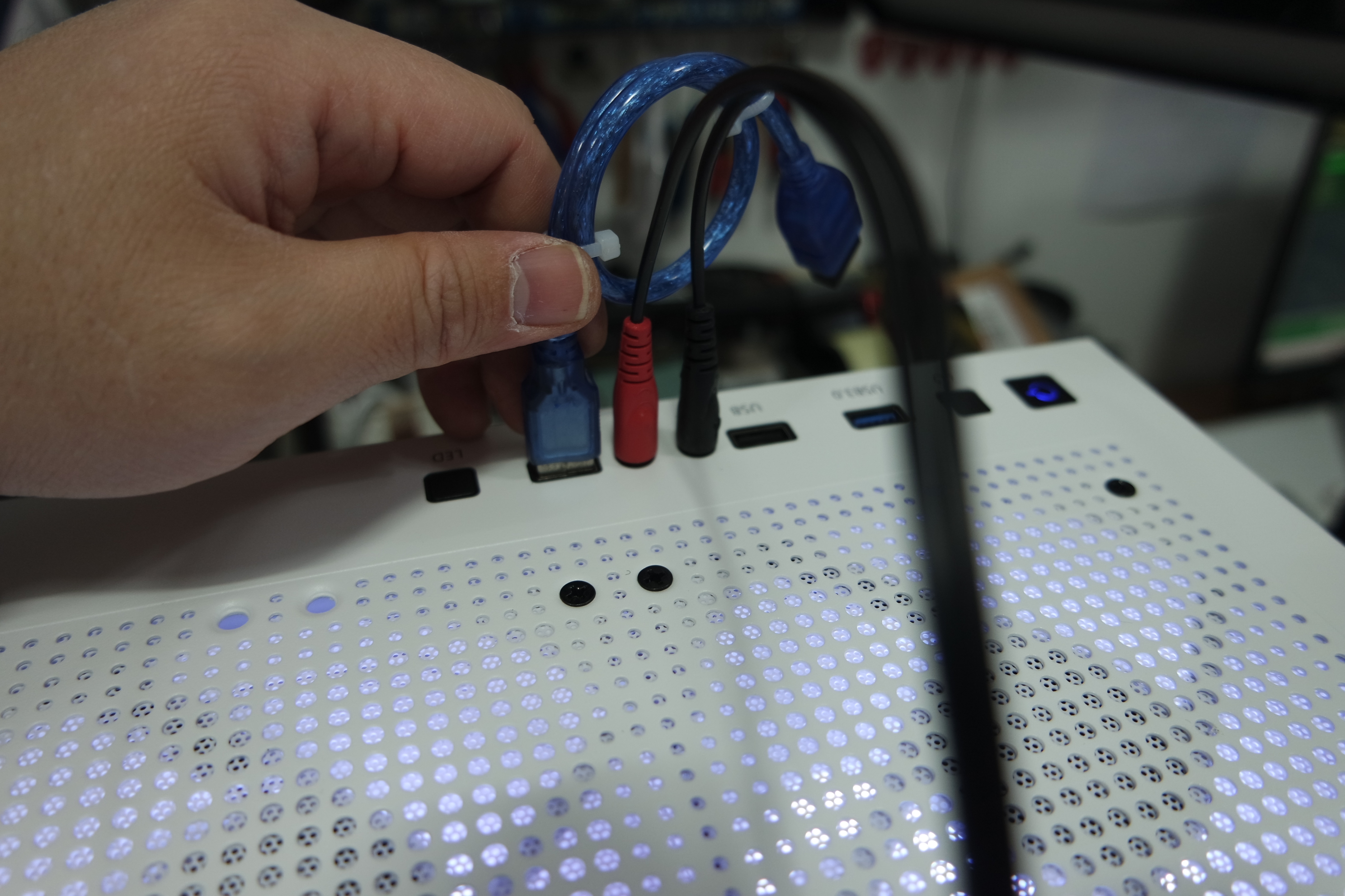 생산&배송 중에 손상 받은 곳이 없는지? 전면 단자와 케이블을 잘 붙어있는지 확인하고 있습니다. 뒤면은 선정리를 위해서 찍찍이 있네요. 벨크로 타이=찍찍이를 뜯으면, 검은색 가루가 떨어져서, 조립 다하고 에어로 털어줬습니다.