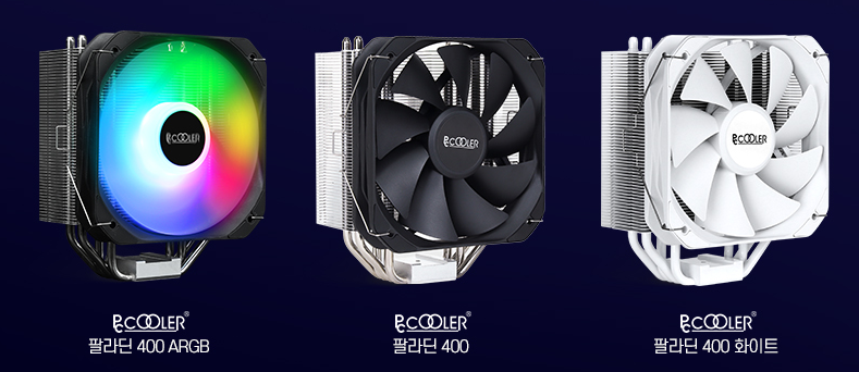 위의 조립된 공랭 쿨러는 팔라딘 400 ARGB 제품입니다. 팔라딘400 제품 라인 중에 흰색으로 도색된 화이트 제품도 있더라고요. LED는 없어서 LED가 켜지는 제품(ARGB)으로 조립했습니다.
