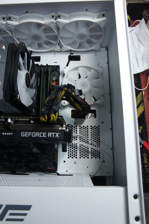 기본 부속 조립하고 추가 팬 4개를 장착해달라는 요청이 있어서 팬을 추가 장착하고 있습니다. C6S (화이트) 팬 4개를 추가로 장착할 예정입니다. 처음에 SATA 선은 생각 안하고 조립했는데요. TUF GAMING B550 PRO 메인보드를 장착하면, 측면에 팬을 달기가 쉽지 않습니다. 메인보드의 사타 단자와 측면 팬을 달 수 있는 공간이 협소해서 간섭이 생깁니다. (아래 사진 참고)