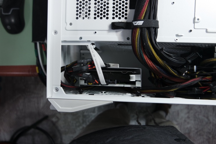 하드디스크를 고정할 수 있는 베이를 앞쪽에 달아놓은 게 신기하네요. 요즘은 하드디스크 사용하는 사람이 그렇게 많지는 않는데, 대부분은 뒤면의 HDD 슬롯 1개로 충분할 거 같습니다. 보드랑 궁합 문제로 하드디스크 고정 가이드는 모두 제거했습니다. (아래에 설명 추가합니다.) 하드디스크나 SSD를 많이 사용하지 않을 계획이라면, 제거하고 케이스 팬을 추가 장착할 수 있습니다.