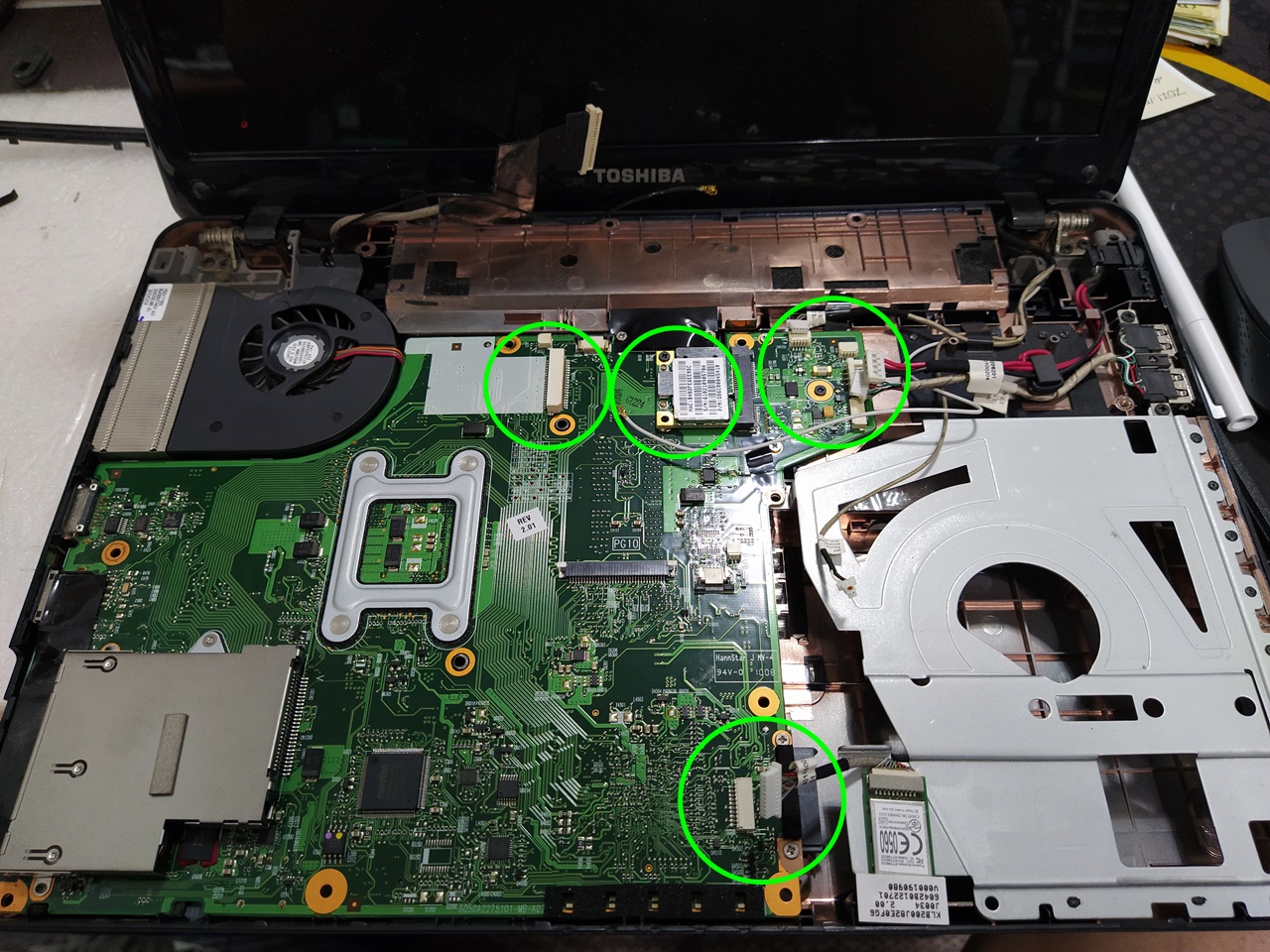 If you're disassembling, please focus on disassembling them. Indication of the attraction of numerous connectors (may not be 100% marked because it was viewed and checked in the picture) In order to completely disassemble the main board from the lower plate, you need to loosen the screw fastened to the lower plate. Not many screws were fastened. I remember unscrewing about two places. There's a screw on the top of the CPU fan. I think a screw was fastened to the main board.