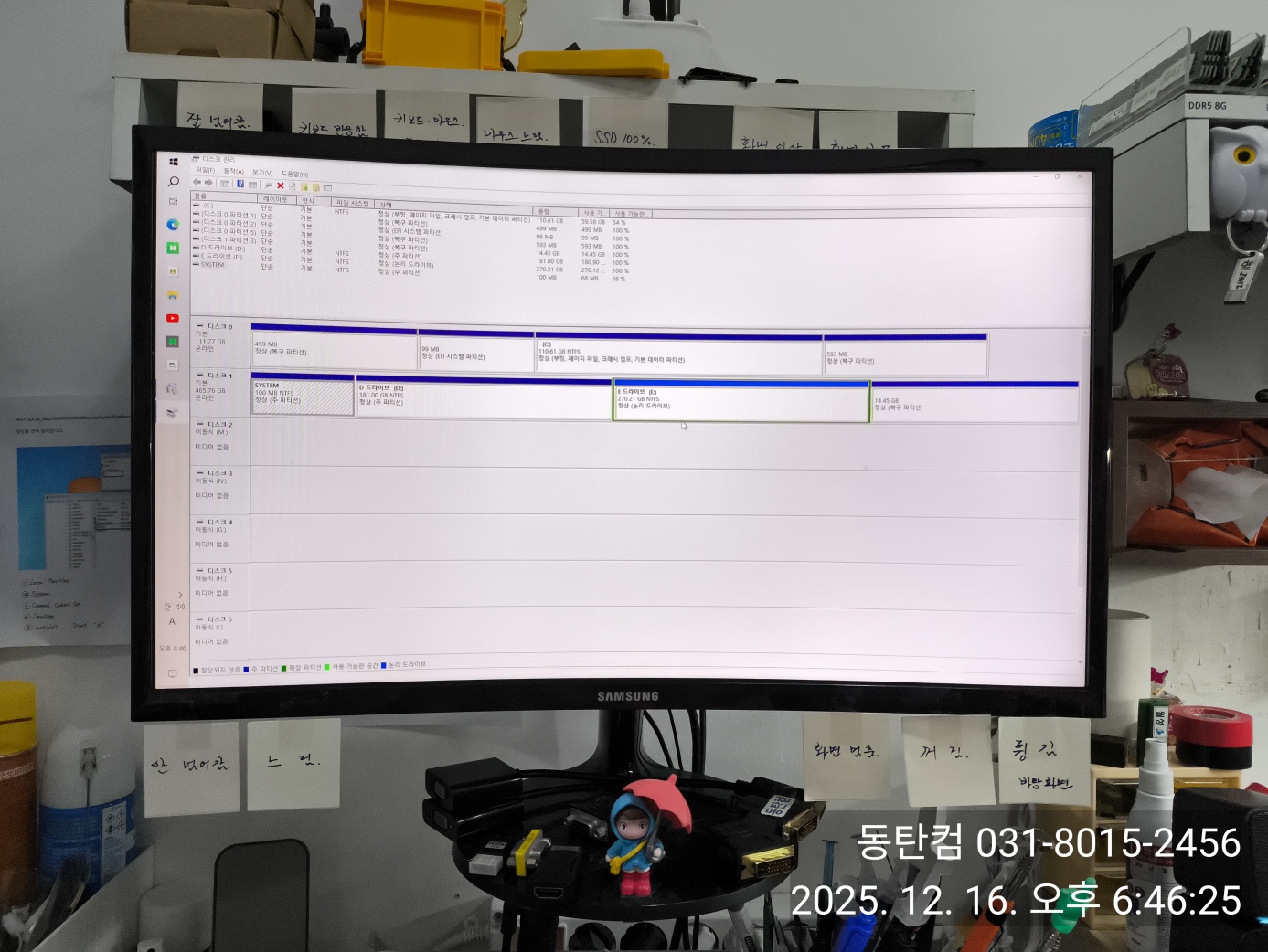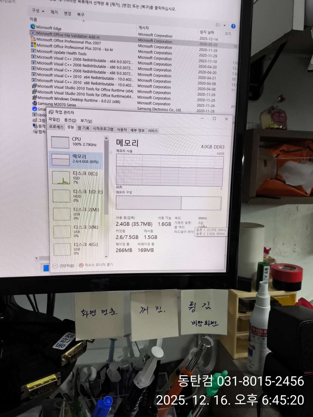 윈도우10 재설치 후에 핵심 수리 내용을 스티커에 적어서 부착했습니다. 그래픽카드 접속 불량 문제는 칸이 없어서, 다 적지는 못했지만, 작업 사진 및 작업 일지에 기록 해둡니다.