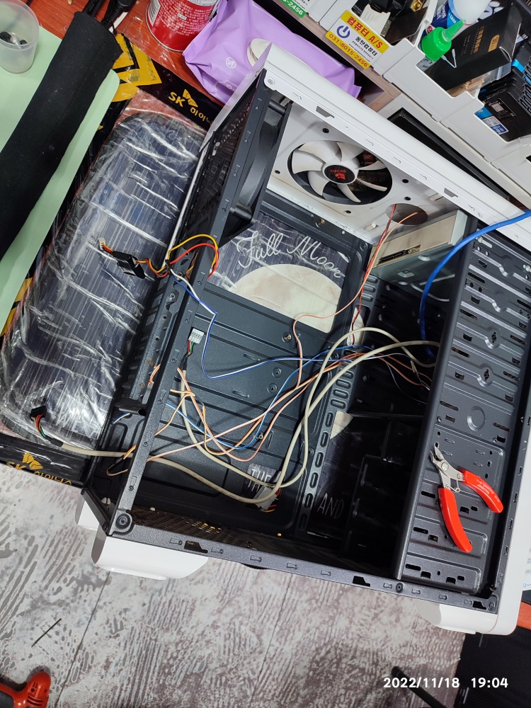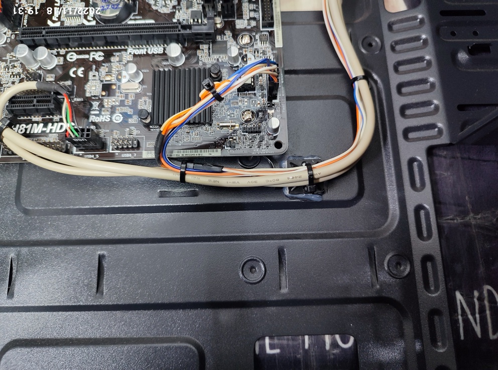 아래와 같이 선정리가 완료됐습니다.사타 케이블도 신품으로 교체했습니다. 비프음 발생하고 화면이 안 뜨는 증상으로 고장 난 메인보드는 정전기 방지 비닐 포장해뒀습니다. 어차피 가져가셔도 집에서는 폐메인보드를 처분하기 곤란해서 폐기 요청을 받았습니다.