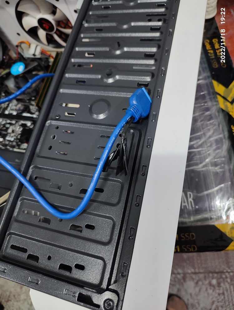 기존에 전면 USB 3.0 헤더를 어떻게 사용하셨는지 모르겠지만 USB 2.0 헤더의 전선이 끊어진 상태이고 합선 방지를 위해서 전기 테이프로 마감을 해놓은 걸 확인했습니다. 전기테이프의 접착제가 묻어 나오지 않는 걸 봐서는 오래된 전기 테이핑 작업은 아니라 생각합니다. USB 2.0 헤더는 이미 짤라서 어차피 못 사용하니깐 USB2.0 헤더 케이블은 짧게 커팅하고 USB 3.0 헤더만 연결했습니다.