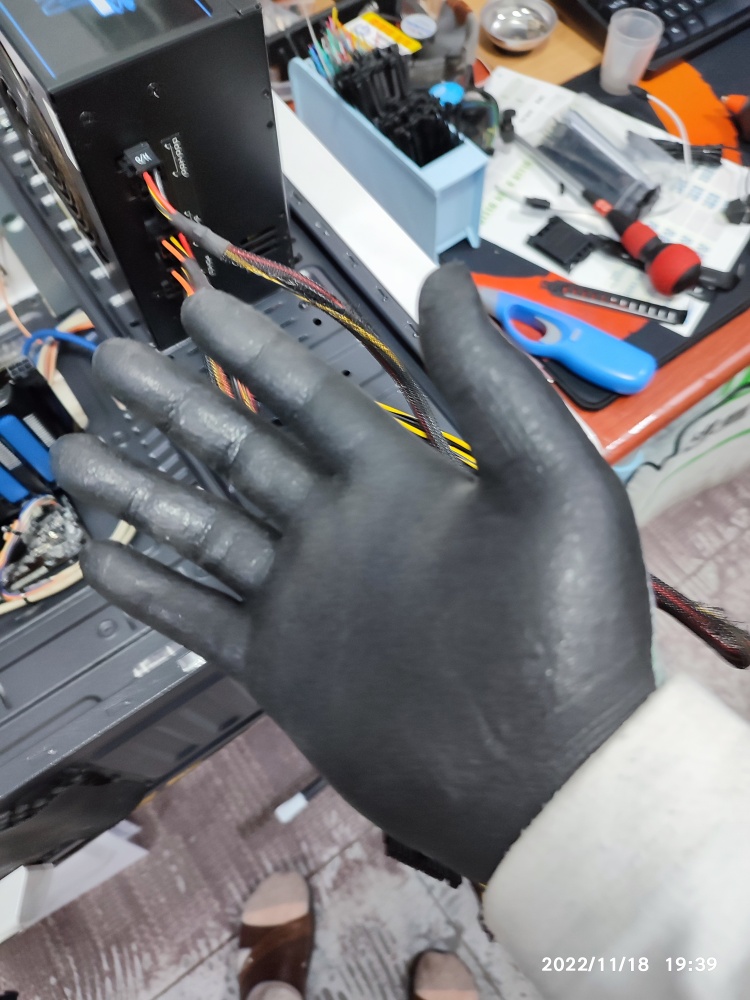 댁에서 어느 정도는 점검해보시고 가져오신 거 같습니다. 24핀 메인 전원 케이블이 제대로 결속이 안된 상태로 보입니다. 파워서플라이의 전선 커버 = 메쉬형 패브릭 실드가 녹아내린 흔적이 보입니다. 메시 커버는 방충망처럼 끝이 굉장히 뽀쪽하네요. 작업하기가 상당히 위험했습니다. 손가락이 찔려서 장갑을 착용했는데도 찔리네요. 전선 덮개(커버)를 가위 또는 칼날로 제거하면서 작업했습니다. 새끼손가락 손톱 밑에 찔린 곳이 하루가 지났는데도 아픕니다. 눈에 보이지 않는 조각이 박힌 건지, 감염된 건지 손가락을 스치면 아프네요. (키보드 타자칠 때도 따끔따끔합니다. 눈으로는 보이질 않습니다.)