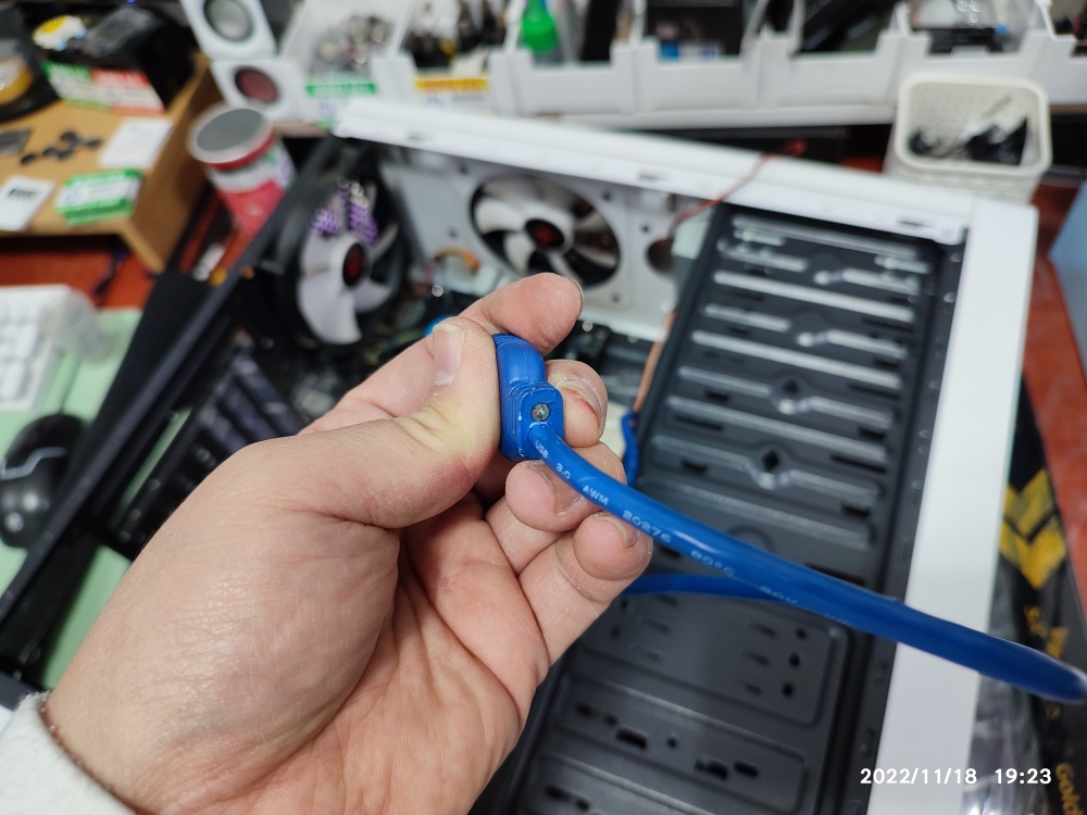 이전 메인보드는 USB 3.0 헤더를 연결할 수 없었지만 교체한 메인보드는 3.0 연장 헤더가 있는 제품이라서 USB 3.0 헤더를 꽂았습니다. 전면 USB 포트가 정상적으로 동작되는지 USB 마우스 리시버를 꽂아서 확인 중입니다. CR2032 메인보드 배터리도 신품으로 교체 후 출고했습니다.