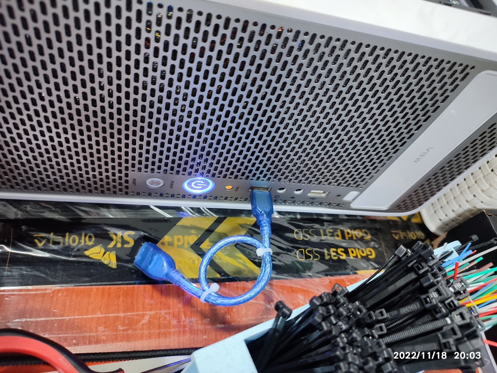 이전 메인보드는 USB 3.0 헤더를 연결할 수 없었지만 교체한 메인보드는 3.0 연장 헤더가 있는 제품이라서 USB 3.0 헤더를 꽂았습니다. 전면 USB 포트가 정상적으로 동작되는지 USB 마우스 리시버를 꽂아서 확인 중입니다. CR2032 메인보드 배터리도 신품으로 교체 후 출고했습니다.