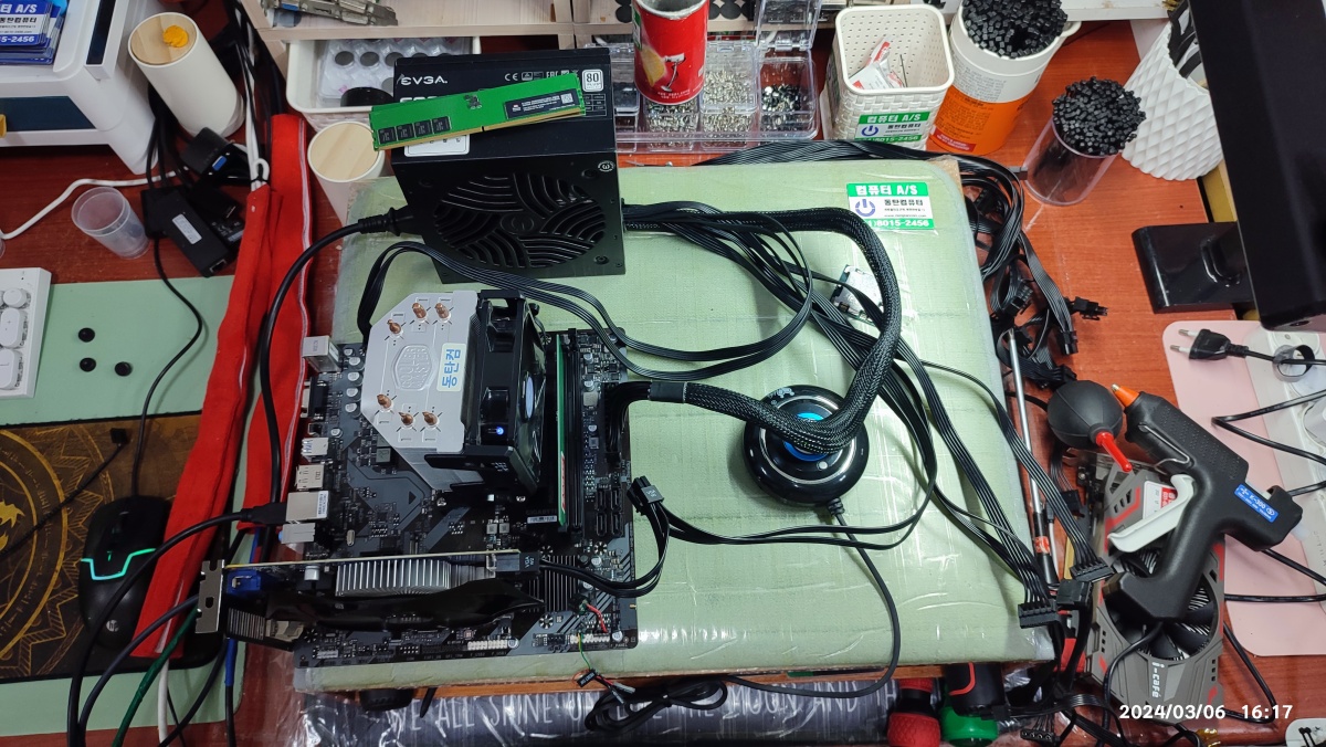 간단하게 교체할 수 있는 부속을 갈아봅니다. RAM, 파워서플라이 순서대로 교체를 해 봅니다. 메인보드를 케이스에서 분해해서, 메모리랑 파워서플라이 등을 교체해도 증상은 동일합니다.
