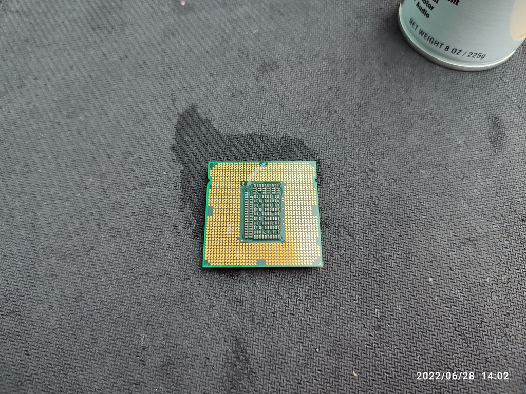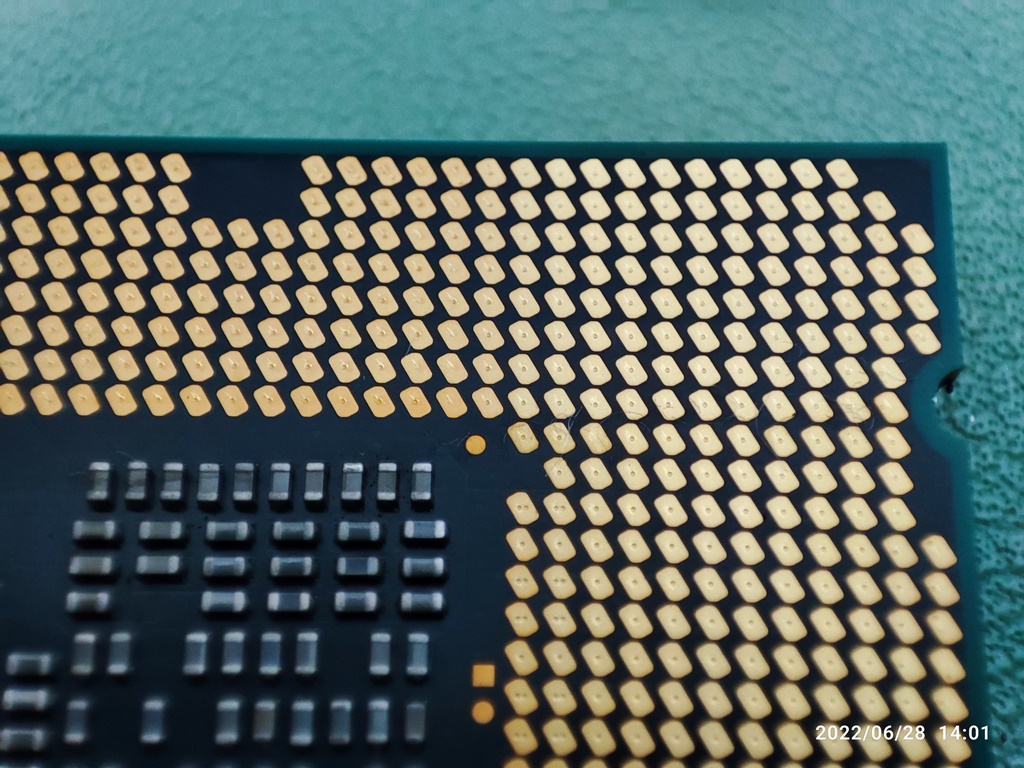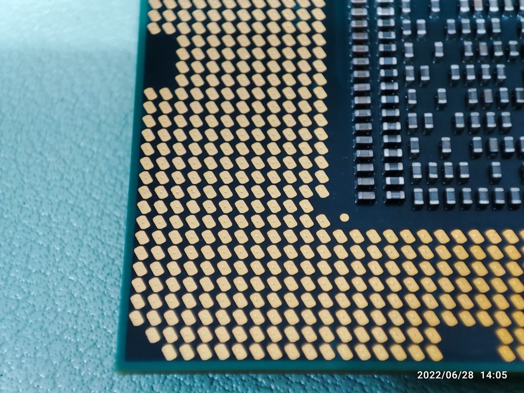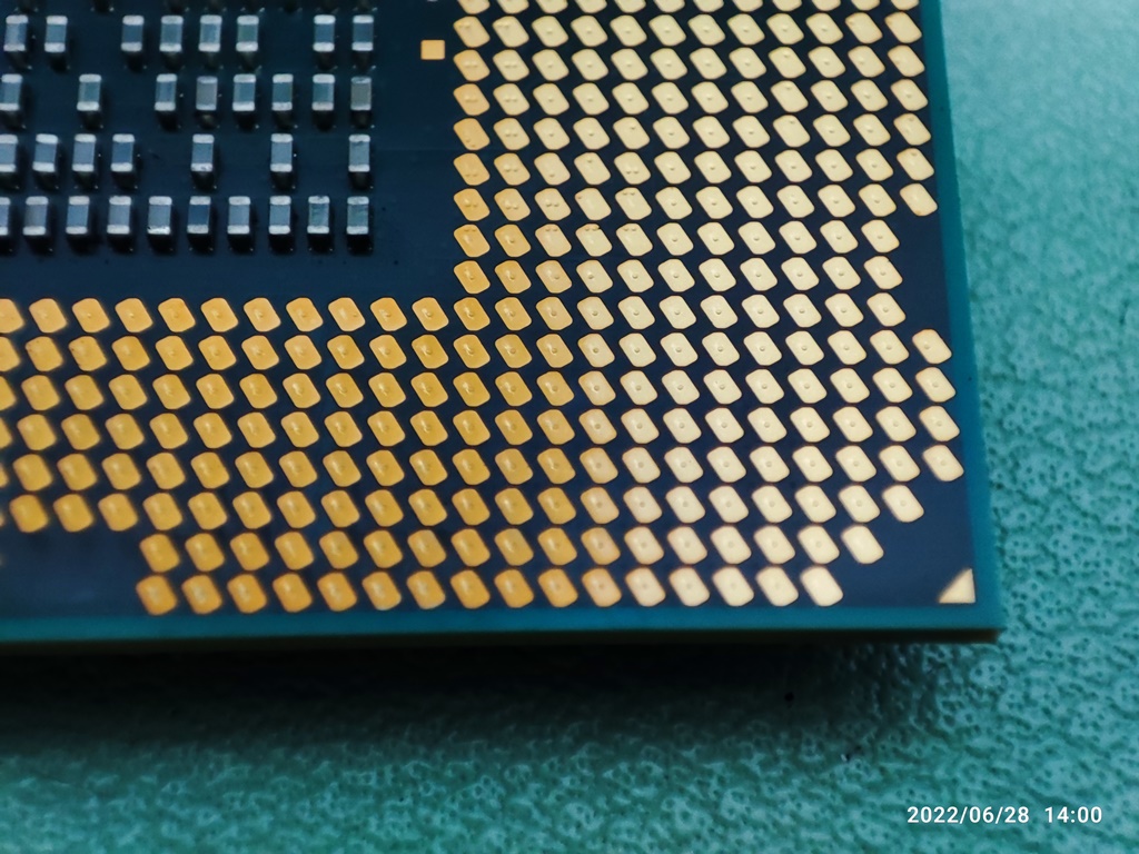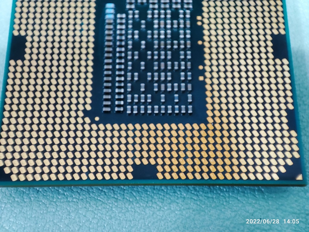 CPU를 소켓에서 분리해서 뒷면의 접점 상태를 확인하고 있습니다. CPU도 오래 사용하면 뒷면의 금속 접점이 누렇게 변색이 생깁니다. 별 다른 이상 증상이 없다면 그냥 사용하셔도 무방합니다. 변색 때문에 오류가 생겼다는 이야기는 못 들어본 거 같네요. 메인보드 기판이 휘어지면서 CPU와 접속 불량이 생길 수는 있습니다.