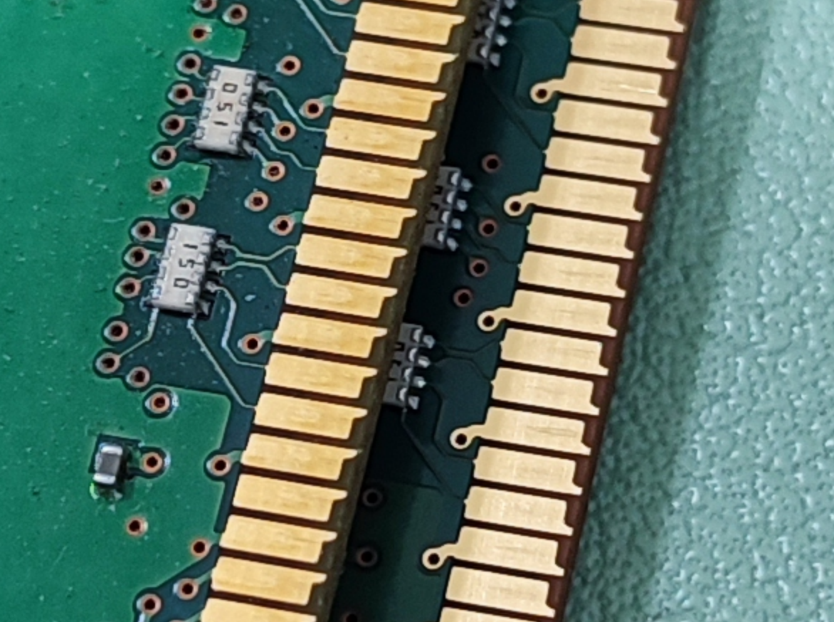 아래는 컴퓨터에 장착된 메모리 2개입니다. 동일 연식의 같은 제조사의 메모리를 쌍으로 사용하고 계셨는데요. 위의 메모리는 원래 입고된 상태이고 밑에 깔린 메모리는 지우개로 골드핑거를 닦은 상태입니다. 지우개로 닦은 면이 훨씬 금색으로 반짝거립니다.