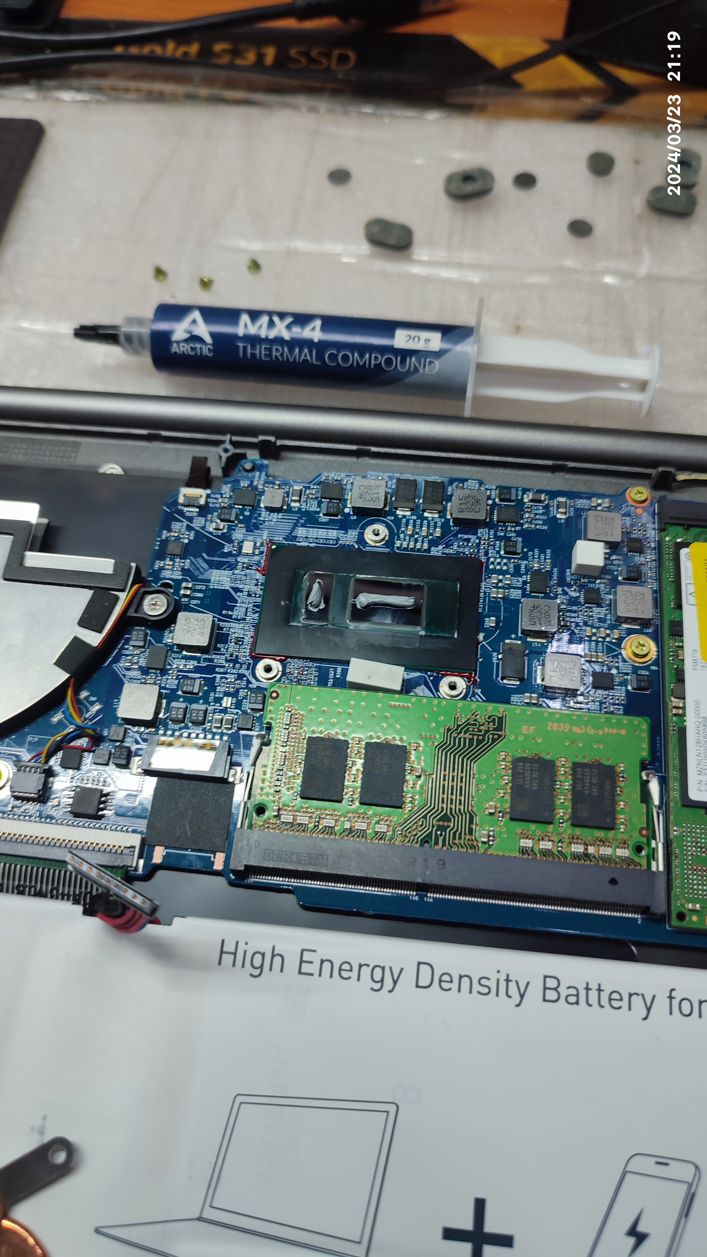 CPU 소켓을 덮고 있는 방열판을 제거하고 CPU 위에 묻은 서멀을 닦아내고, 새로운 열전도체를 재도포했습니다.