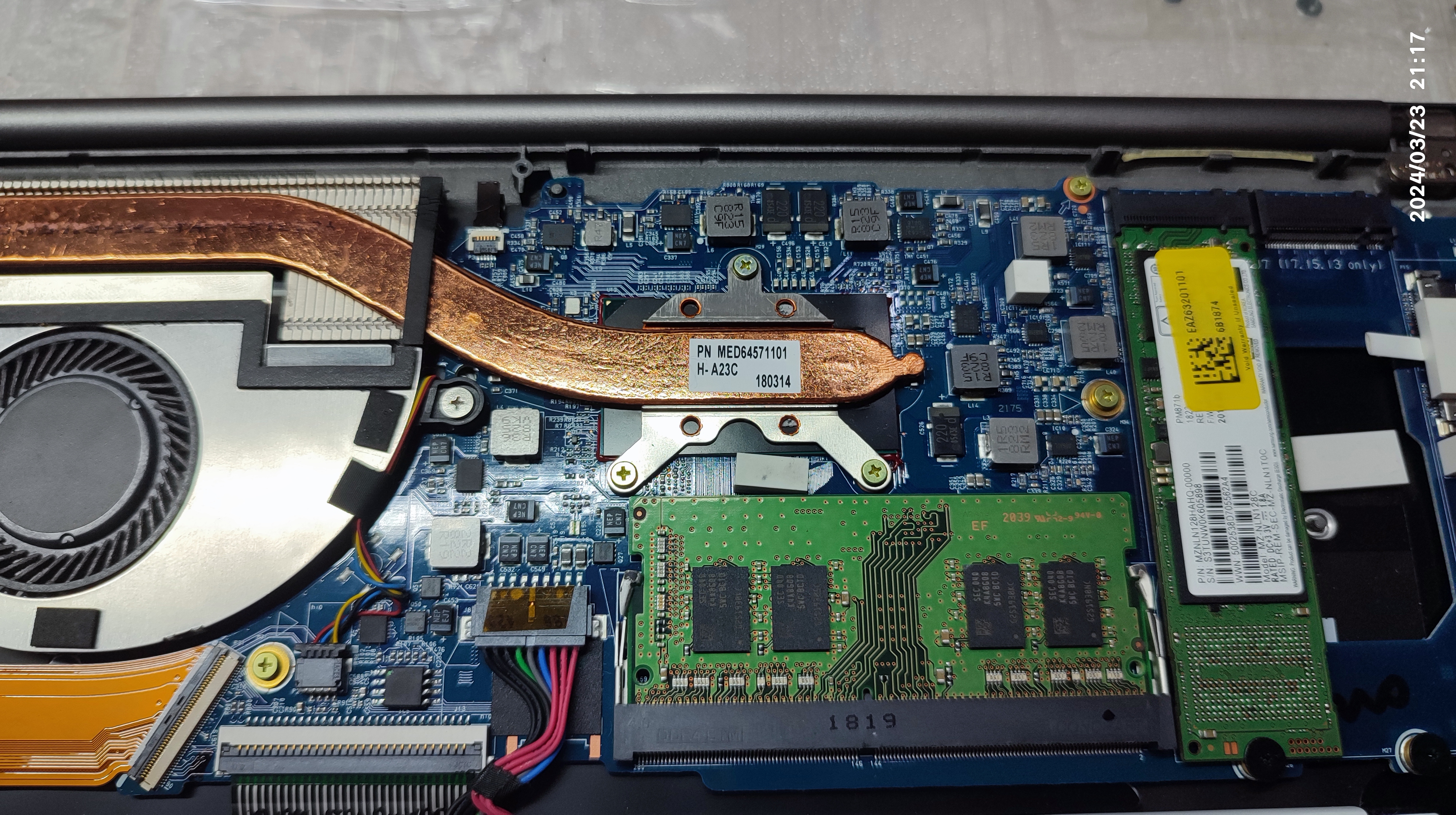 SSD는 M.2 SSD (SATA규격) 제품이 장착된 상태입니다. SSD는 접속 불량 증상이 있을 수 있기 때문에 분해했을 때, 제거해서 닦아서 다시 장착했습니다. 2개의 M.2 SSD 슬롯이 만들어진 상태인데, 오른쪽 슬롯은 i7, i5, i3 CPU가 장착된 경우에 동작된다고 적어놨네요. 팬티엄이나 셀러론 CPU가 장착된 경우에는 이 슬롯을 굳이 붙여놓지는 않았을 거 같습니다. 저도 확인한 건 아닙니다. 나중에 비슷한 모델이 입고되면 확인해 보겠습니다. 기판에 NVMe 지원 여부는 적어두지 않았네요. M.2 소켓을 두개나 만들어 놓은 만큼, NVMe 타입도 지원될 것으로 보입니다. 요즘(2024년)은 SATA규격의 M.2 SSD는 거의 단종됐고 대부분이 NVMe 방식으로 나와서 선택의 여지가 없기는 합니다.