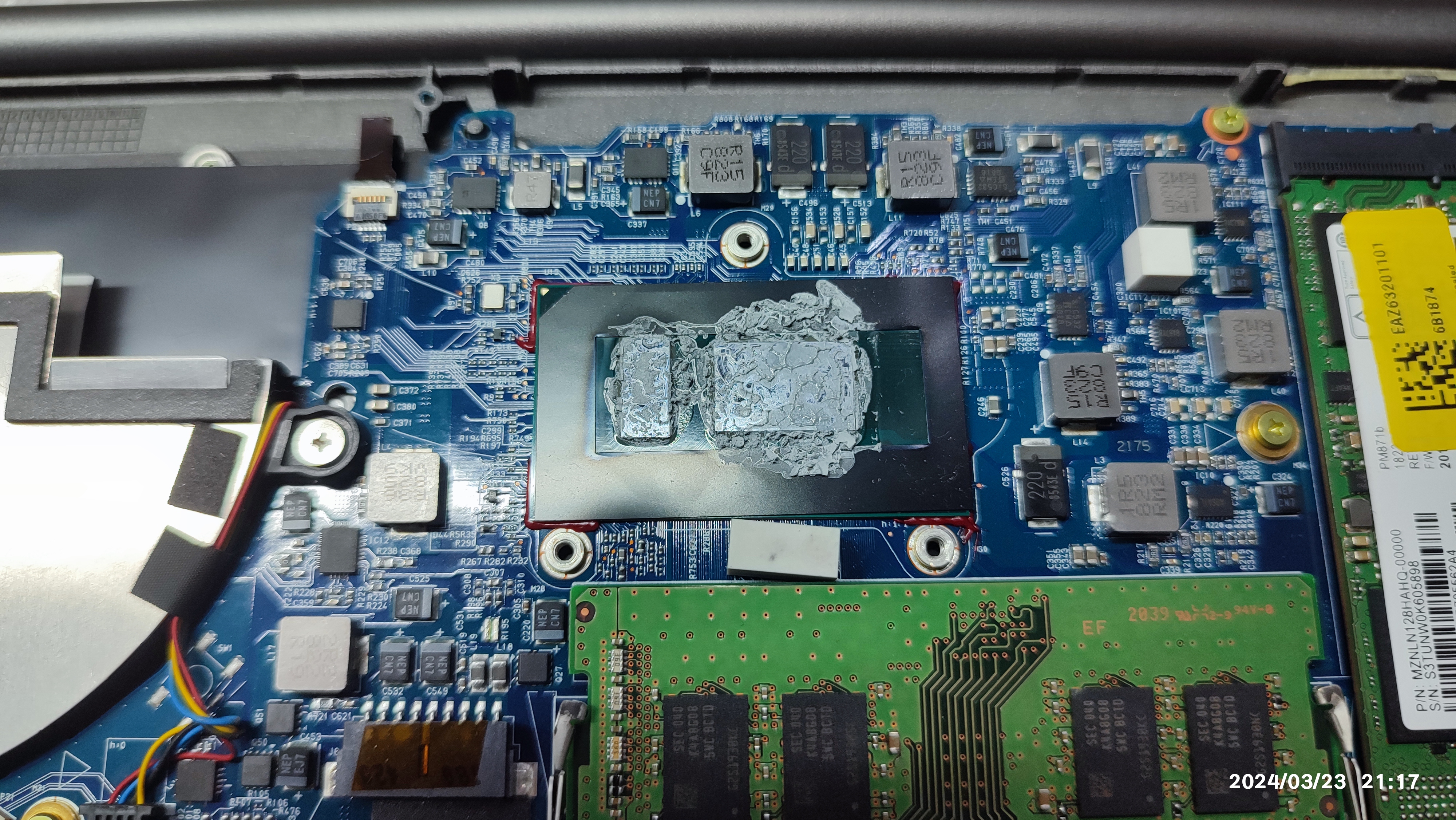 CPU 소켓을 덮고 있는 방열판을 제거하고 CPU 위에 묻은 서멀을 닦아내고, 새로운 열전도체를 재도포했습니다.