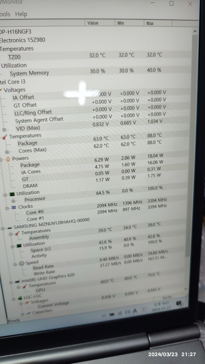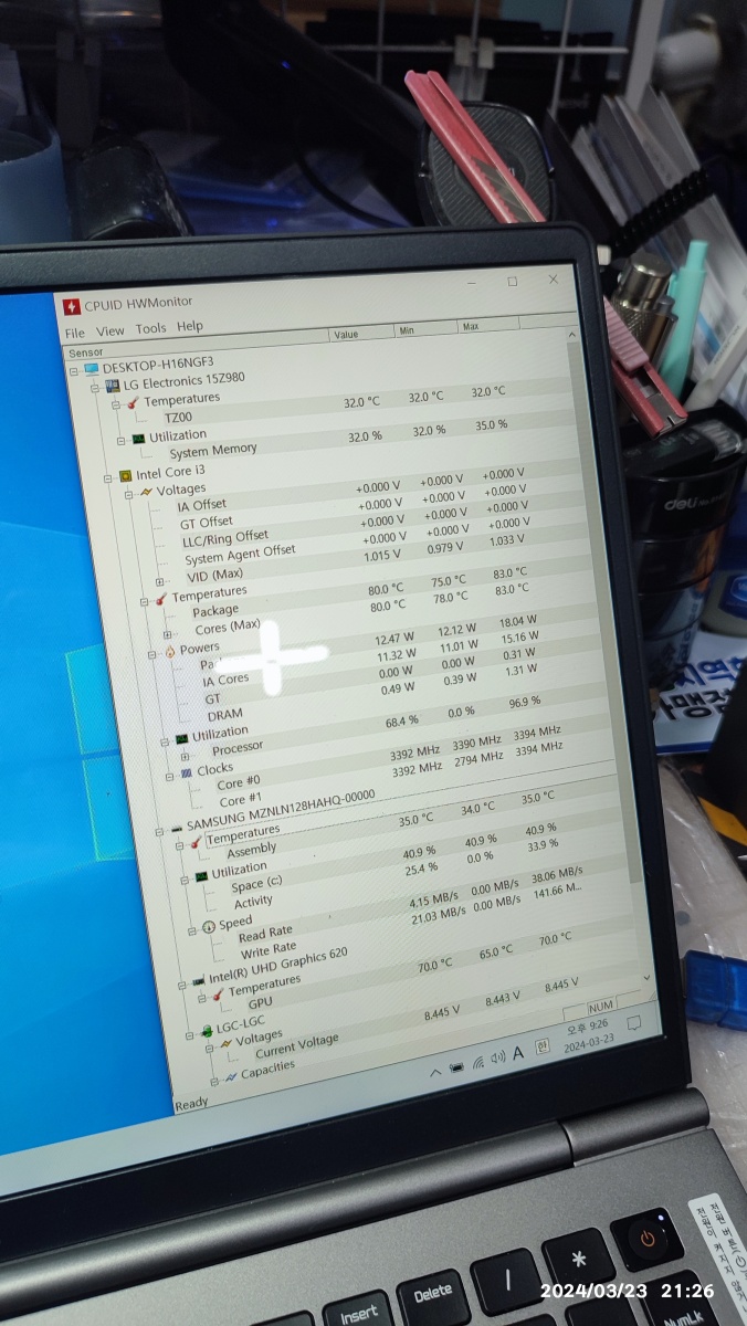 CPU 서멀 구리스를 재도포해도 온도가 극적으로 떨어지진 않습니다. 기본 CPU 온도가 높습니다. 최대 온도는 83도 찍히고 있네요. 과부하 작업을 진행하면 90도를 찍을 거 같습니다. 조용한 독서실 같은 곳에서 사용할 때, CPU 온도가 급격하게 올라가면, 팬 소음(고속 회전)이 발생될 수 있기 때문에 터보 부스트가 터지지 않게끔 CPU 최대 성능을 낮춰서, 사용하는 것도 방법이 될 수 있겠습니다.
