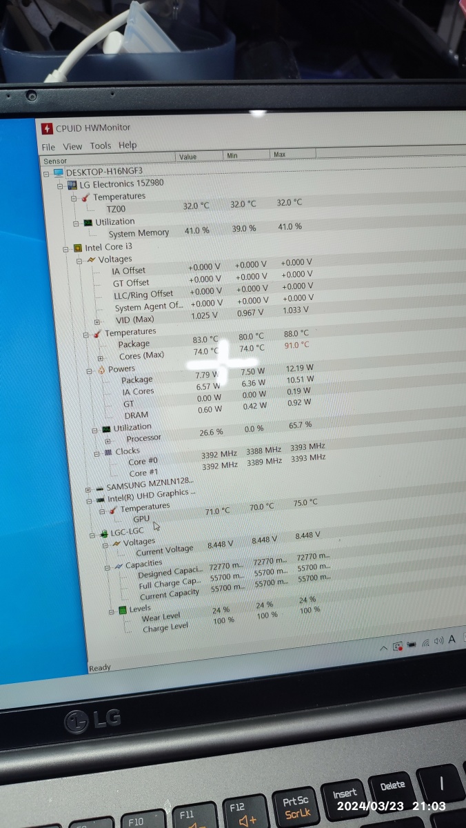 윈도우10 재설치하고 윈도우 업데이트 과정에서 노트북의 CPU 온도를 체크하고 있습니다. 최대 온도가 91도가 찍히고 있습니다.