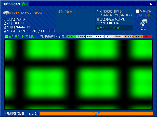 제품에 들어있는 하드드시크는 도시바 500기가 하드디스크 제품 MQ01ABF050 이 들어있었습니다. SSD 업그레이드를 진행하면서 동시에 서브컴퓨터에서 도시바 500기가 하드디스크의 표면검사를 진행해봤는데요. 별이상이 없었습니다.