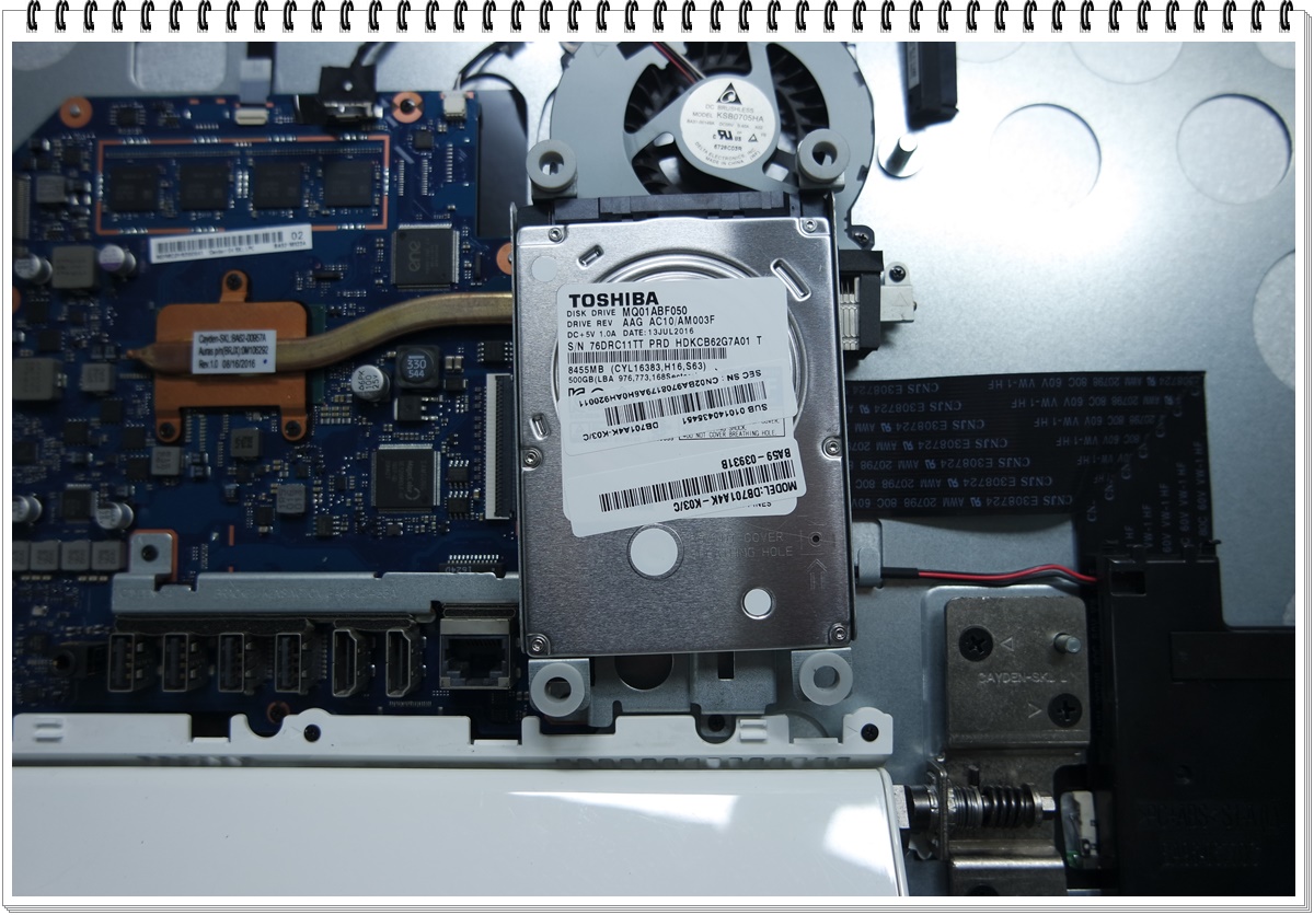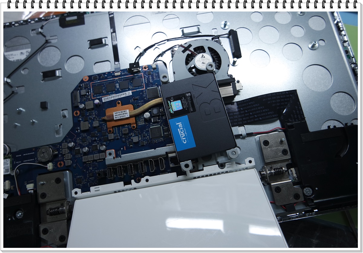 교체될 SSD는 크루셜의 240기가 SSD입니다. 대원CTS 유통사 제품으로 보증 스티커를 잘 부착한 다음 하드디스크 자리에 교체 장착후 고정했습니다. 하드디스크 고정 나사는 대각선으로 2개 밖에 없었고 조금 헐렁합니다. 일체형 컴퓨터라서 노트북처럼 이동하면서 사용하는 컴퓨터는 아니기 때문에 조금 느슨하게 만든 것이 아닐까 싶기는 한데요. 하드디스크라면, 하드디스크의 모터 진동을 잡아주기 위해서라도 4군데 모두 나사로 고정해놓고 사용하는 것이 좋지 않을까는 생각이 드네요. (큰 회사니깐 사소한 것도 다 테스트해보고 설계해서 진행했을 거라 믿습니다.)