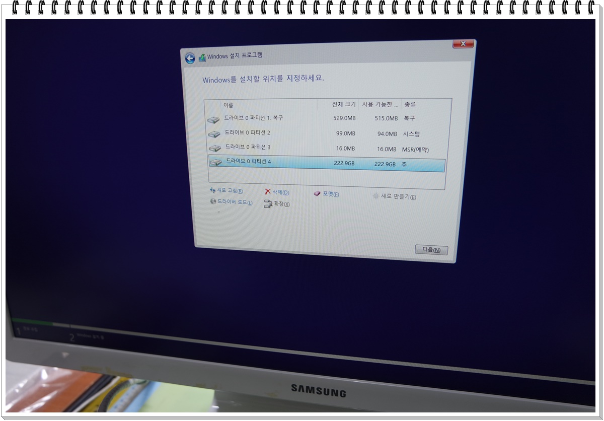 윈도우10 설치화면에서도 SSD 240기가가 정상적으로 인식되고 정상적으로 파티션되는 것을 확인할 수 있었습니다.