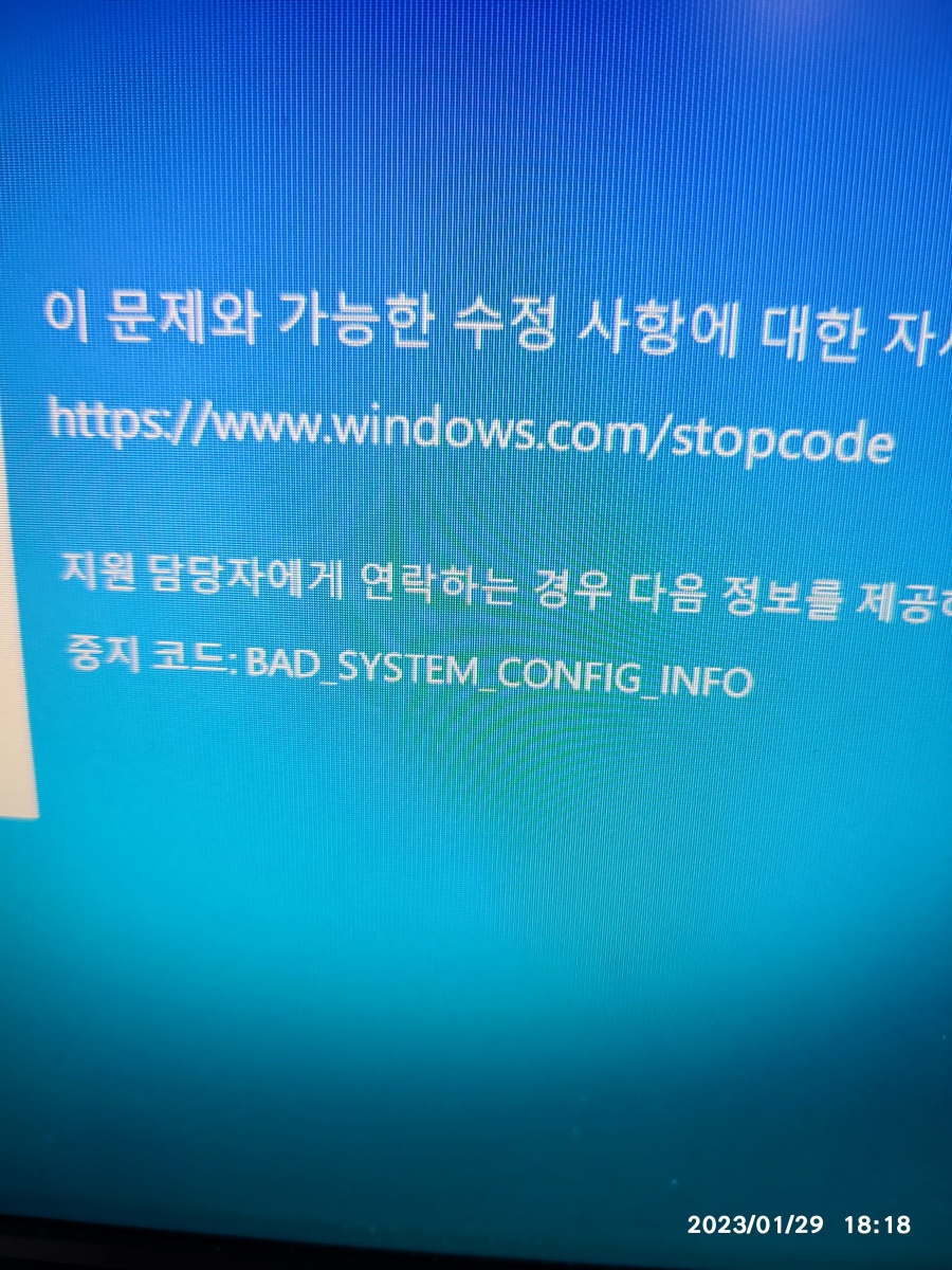(1) 접수 증상은 잘 사용하고 종료하고 다음날 컴퓨터를 켰는데, 정상적으로 바탕화면 진입이 안 됩니다. 그리고 블루스크린(BAD_SYSTEM_CONFIG_INFO)이 뜨는 증상입니다.