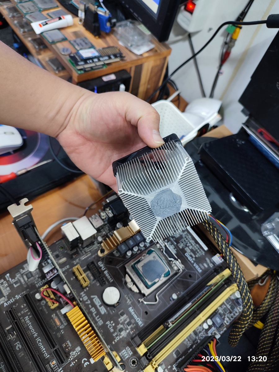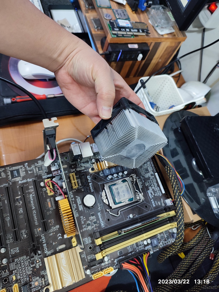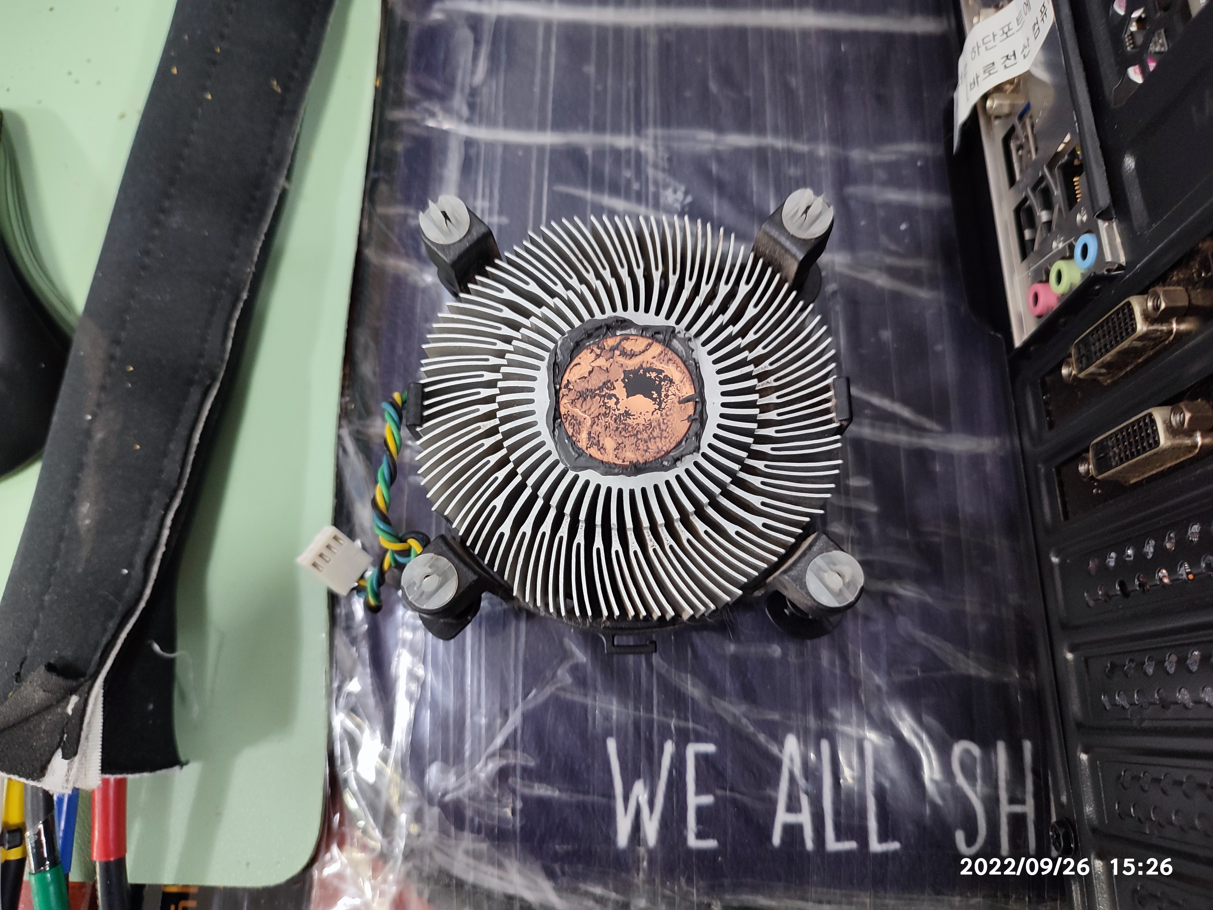 (4) 매장에 굴러다니는 사제 쿨러를 올려봤습니다. 고정하기 귀찮아서 락킹도 없이 CPU 위에 쿨러를 올려놨습니다.