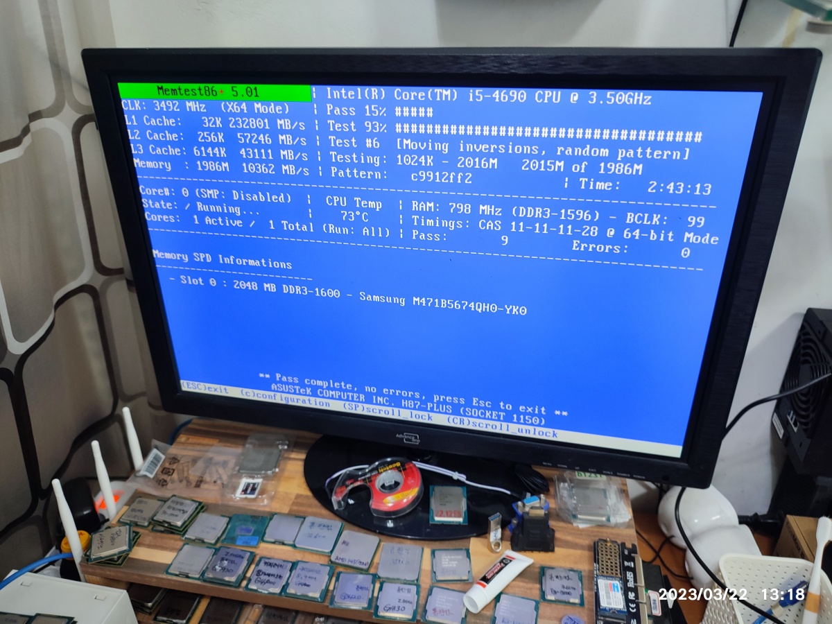 i5-4690 CPU로 메모리 테스트 진행 중인데요. 서멀을 안 바르고 테스트했더니, CPU 온도가 73도까지 올라갔네요. 73도가 낮은 온도는 아니지만 CPU에서 그렇게 높은 온도는 아닙니다.