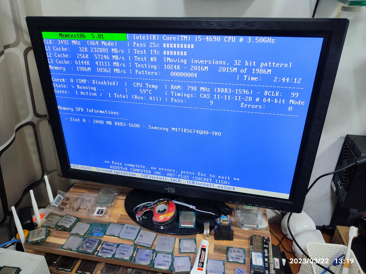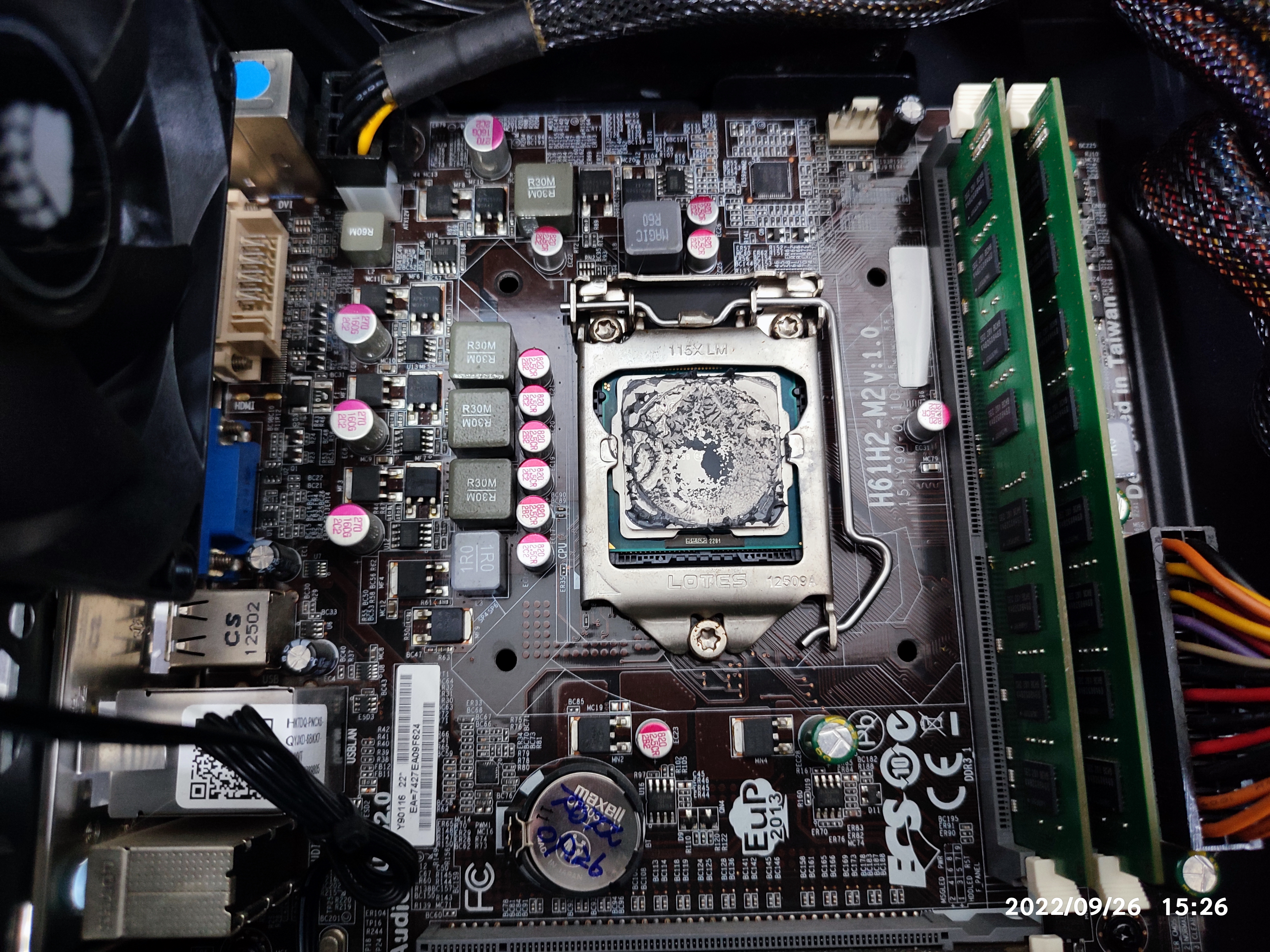 메모리 테스트 프로그램은 도스에서 돌아가는 프로그램이라서 CPU 사용률이 그렇게 높지 않은 프로그램입니다. 원래는 컴퓨터를 끄고 서멀을 다시 바르고 테스트하는 게 원칙적으로 좋지만, 잠시 방열판을 들어서 서멀 바른다고 바로 100도를 찍고 꺼지지 않기에, 컴퓨터가 켜진 상태로 = 동작 중에 서멀을 다시 발랐습니다. (방열판도 나사나 체결 걸쇠 없이 올려둔 형태라서 가능합니다.)