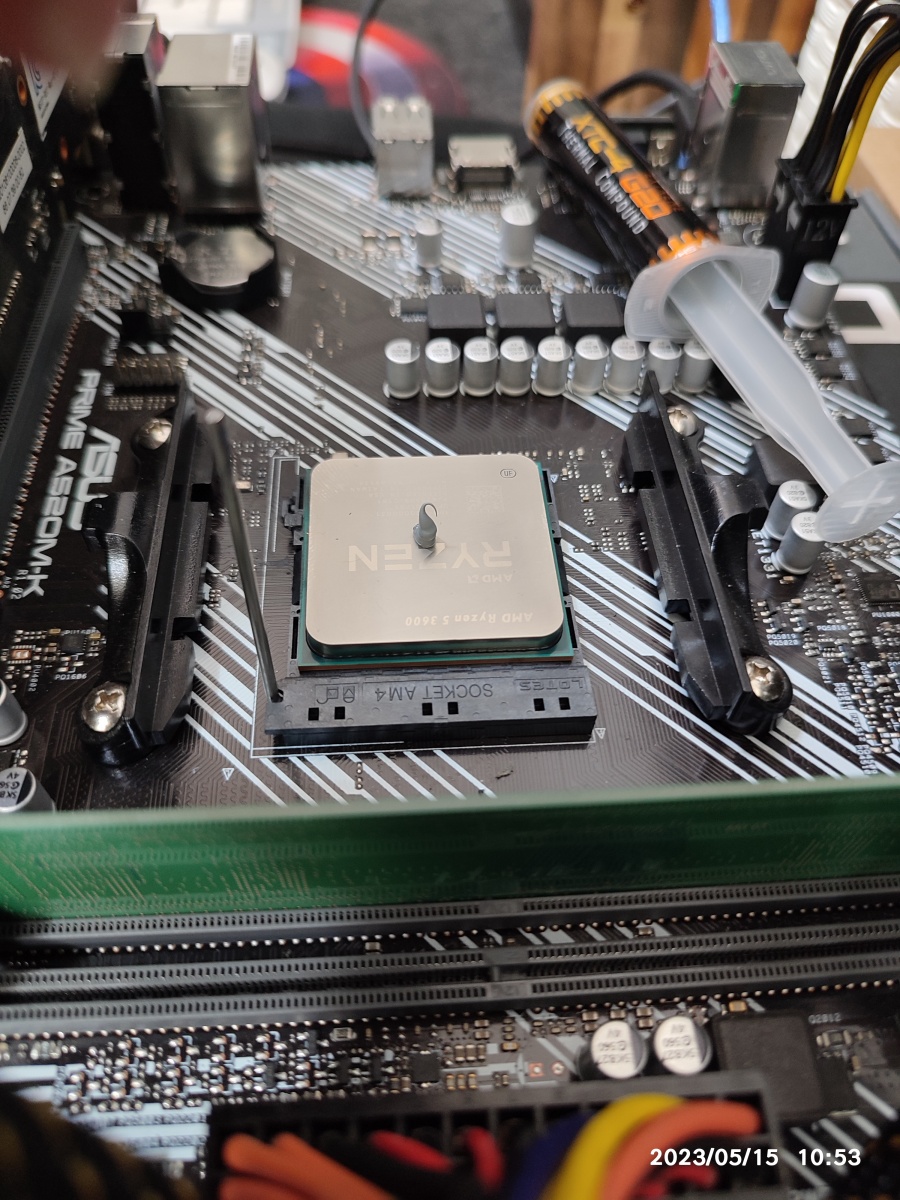 오른쪽으로 충분히 펼쳐지지 않았네요. (이 정도만 펼쳐져도 3600 정도의 CPU라면 온도를 잡힙니다. CPU 전체 모든 부분에서 발열이 생기는 게 아니고 특정 부분에서 발열이 심한 부분이 있는데, 그 부분에 서멀을 잘 발라두면, 전체를 서멀로 덮지 않아도 충분히 열전달이 잘 이뤄지는 거 같습니다. 위의 콩알만큼 중심에 조금만 발라도 온도가 잡히는 것처럼, 물론, 방열이 엄청 높은 CPU는 전체적으로 잘 펼쳐 바르면 더 효과가 좋을 것으로 생각되니깐 빈틈없이 펼쳐서 바르도록 작업하는 게 좋다고 생각합니다.)
