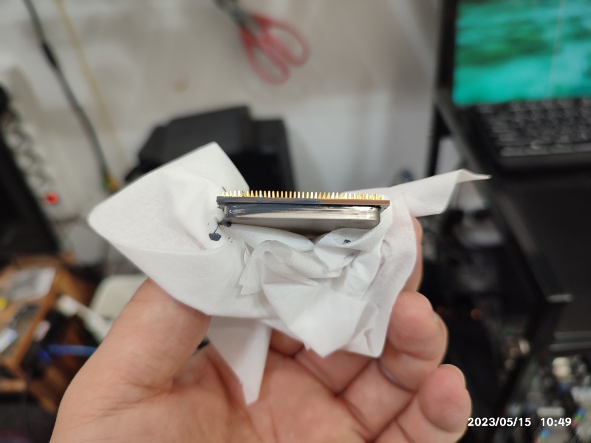 CPU 옆면에 묻은 서멀을 닦아내려면, (마른 상태) 미세모 칫솔로 털어주면 됩니다. 서멀 제거가 끝나면, 칫솔은 물티슈에 다시 한번 닦아줍니다. 칫솔에 묻은 서멀은 WD40에 담겨서 제거한 적도 있습니다. (관련글 : 칫솔에 묻은 써멀 + WD40)