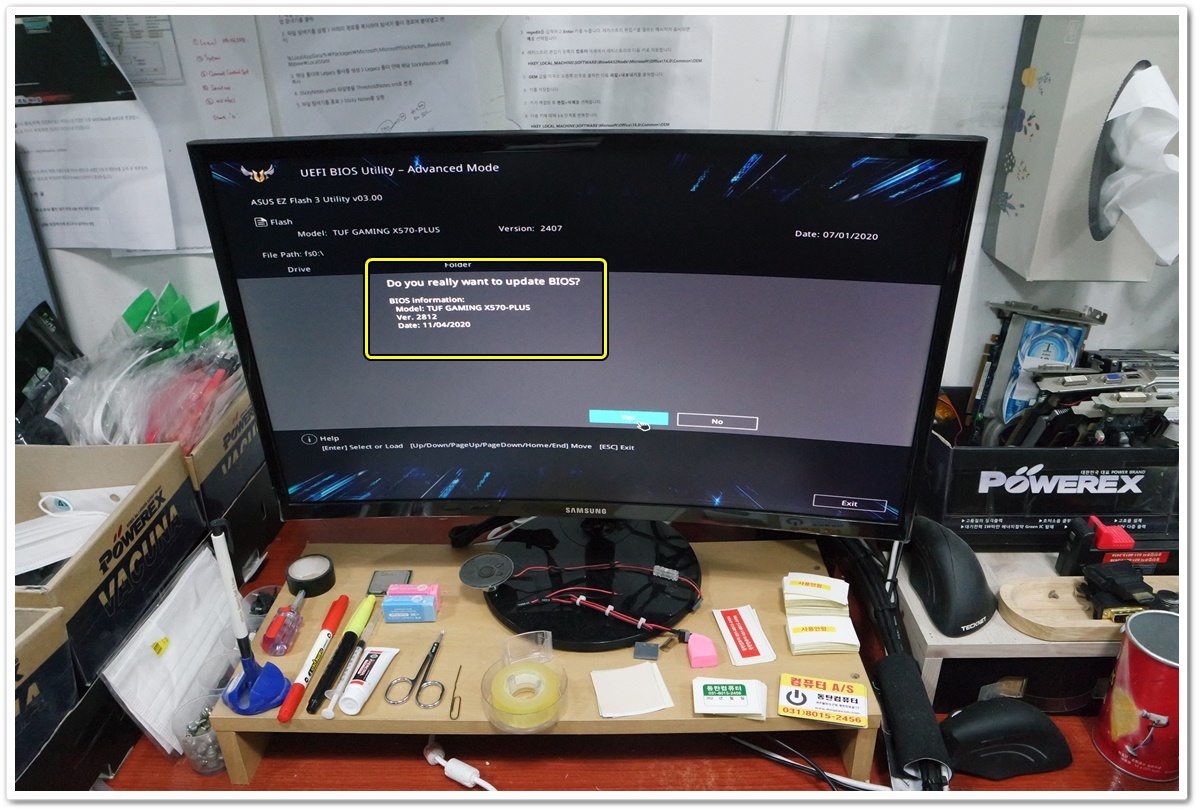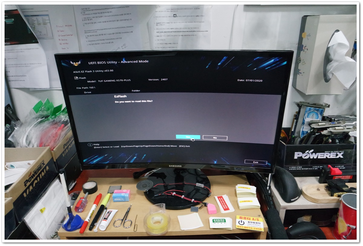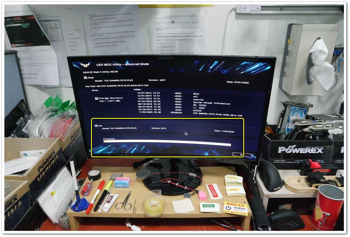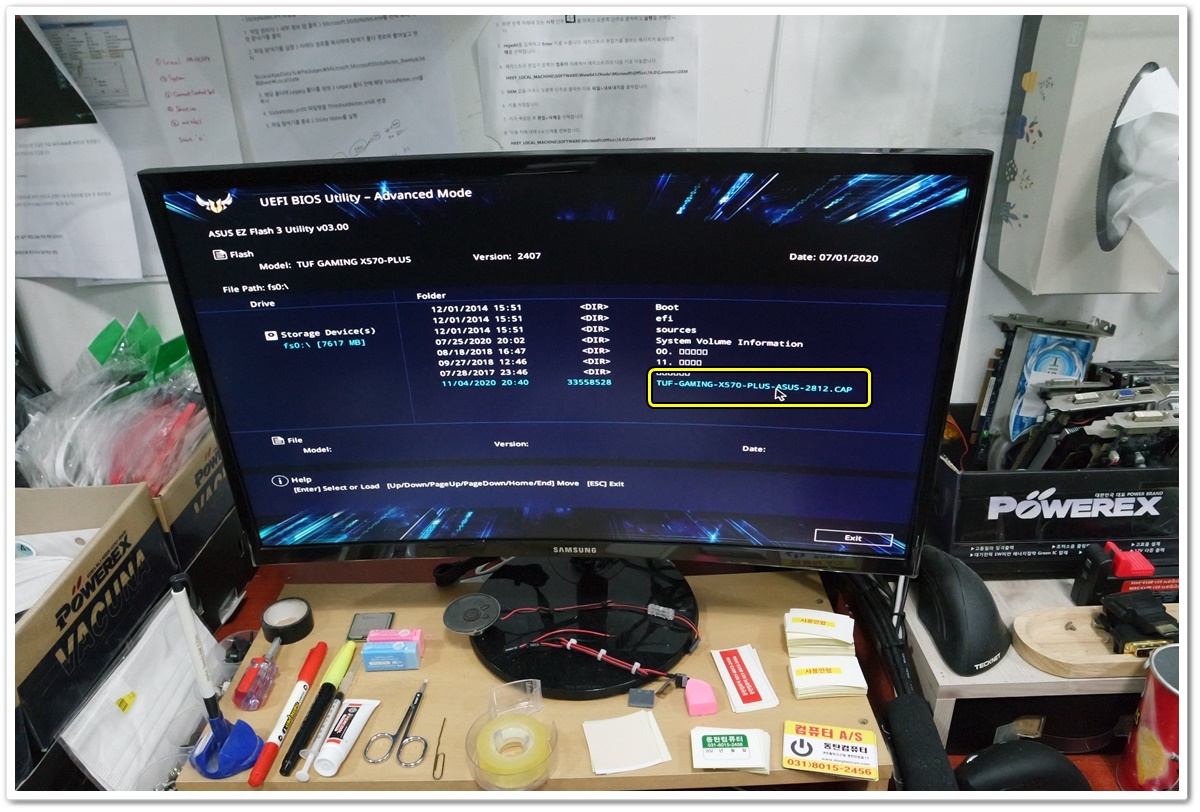 다른 컴퓨터에서 ASUS 홈페이지로 접속하고, 최신 버전의 바이오스를 다운받아서 USB 메모리에 압축해제를 했습니다. 그리고 업데이트를 진행할 ASUS X570 메인보드에 USB 메모리를 연결하고 EZ Flash 3 Utillity 를 활용해서 바이오스 업데이트를 진행할 예정입니다.