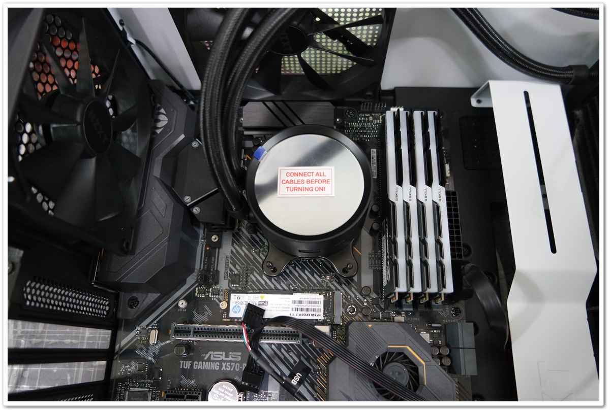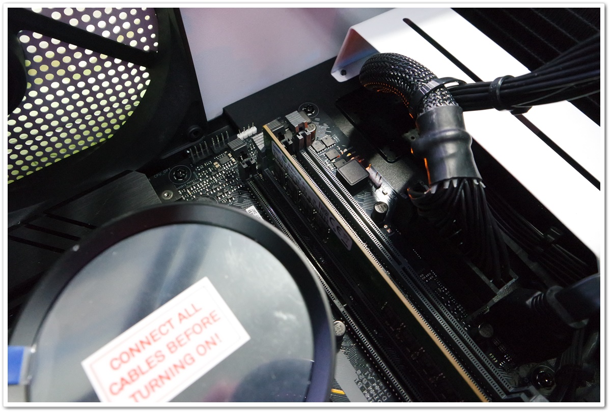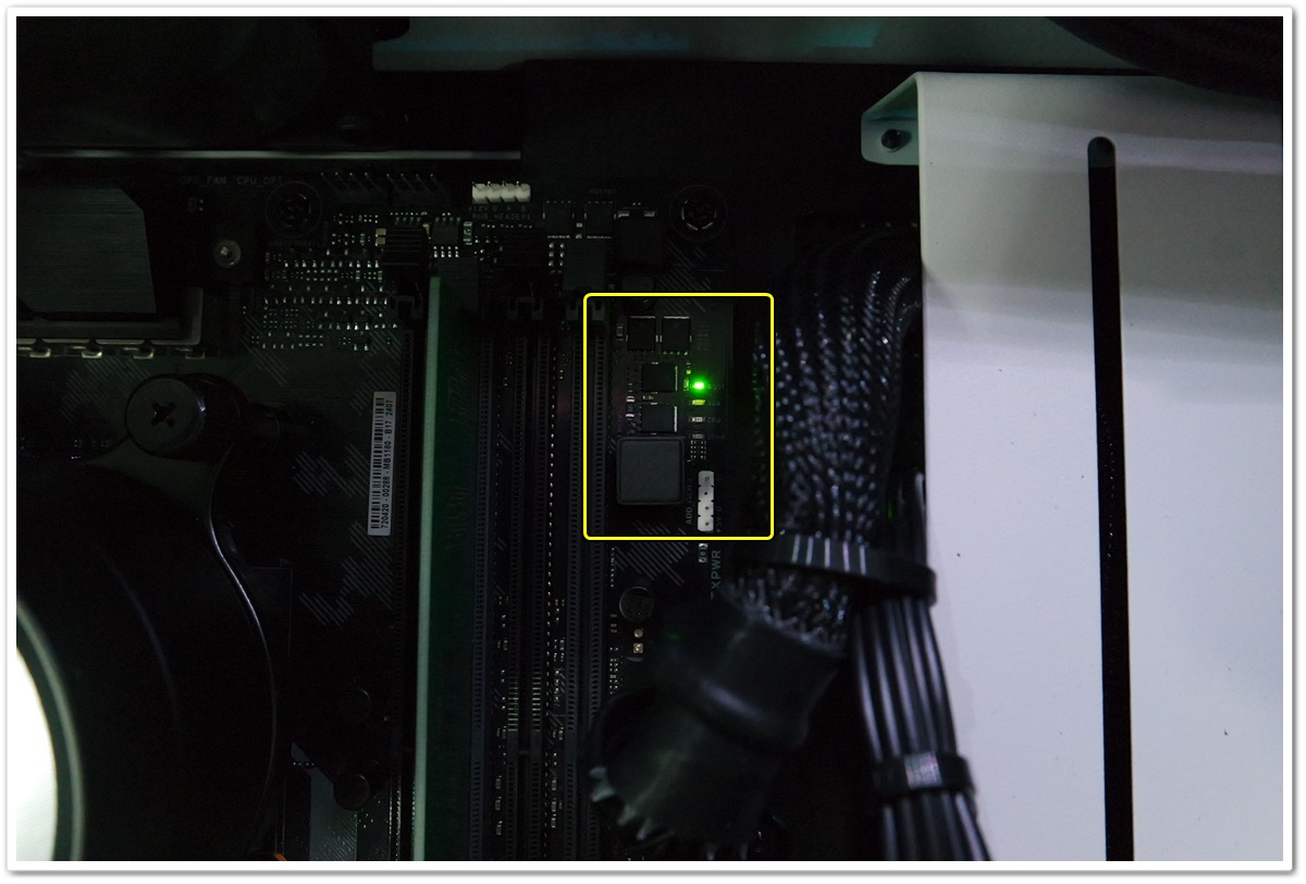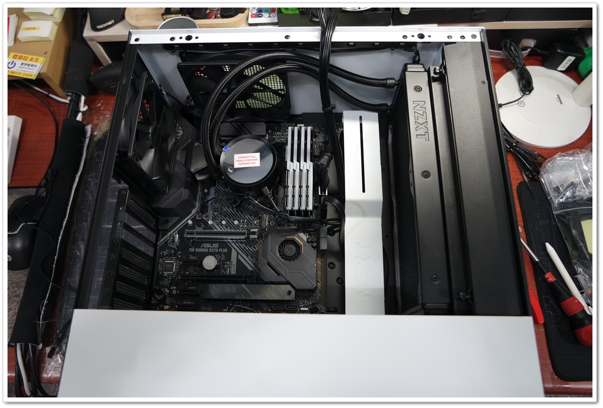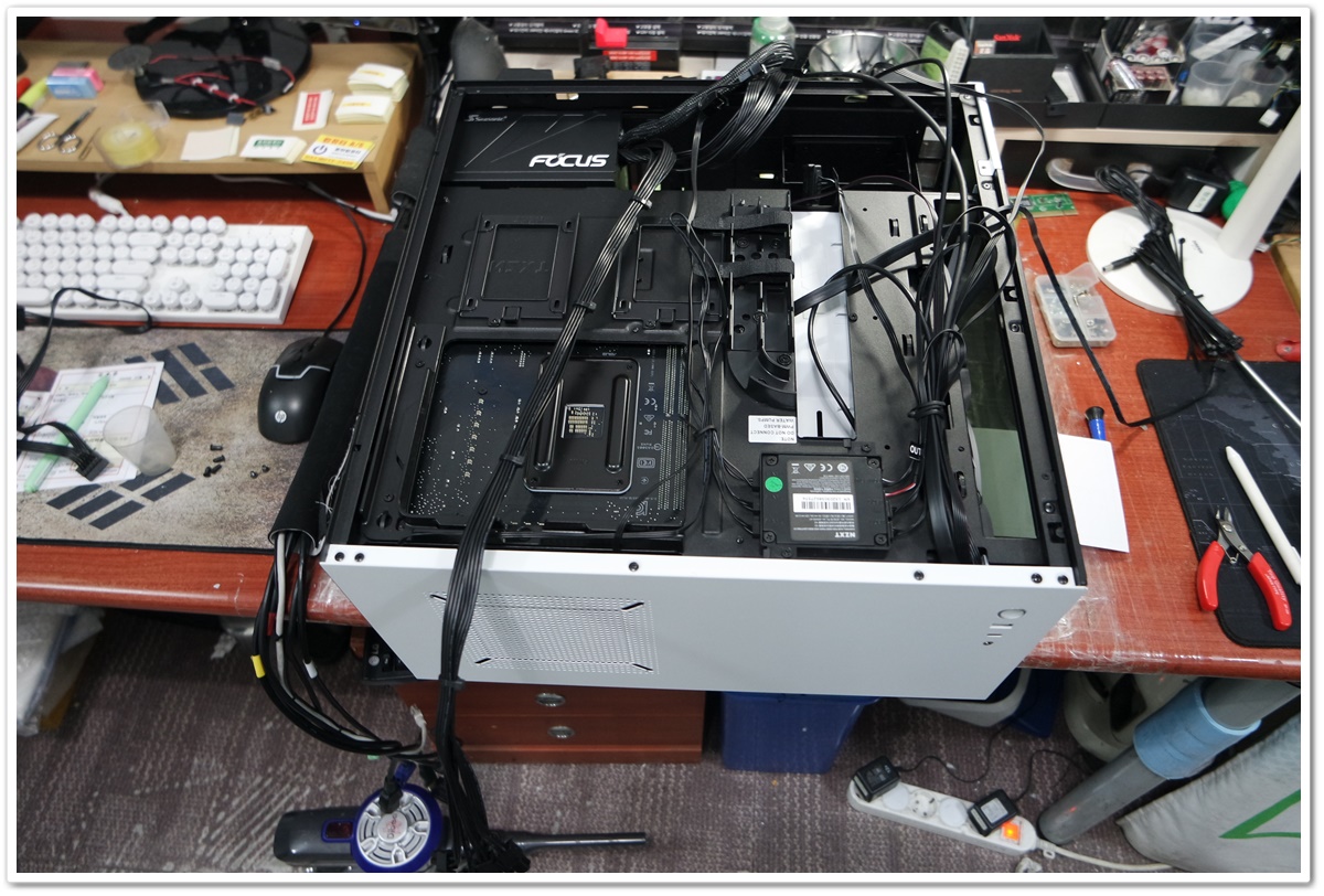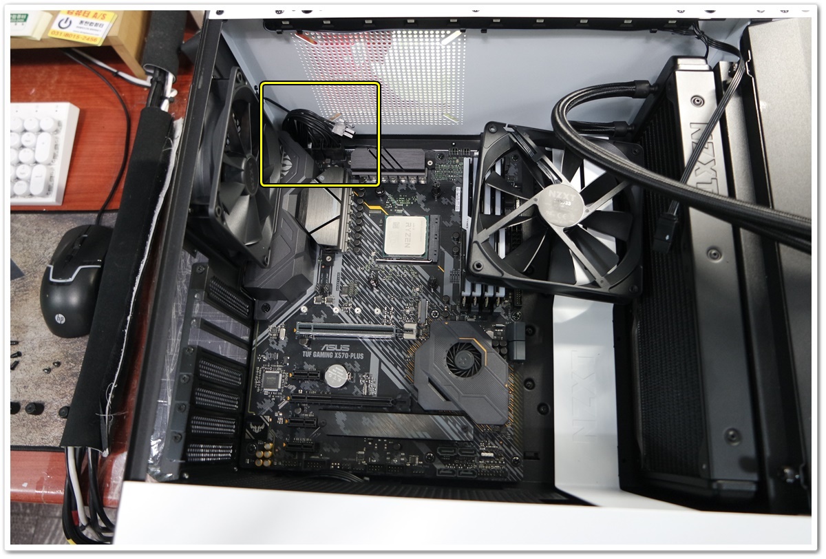 공간이 워낙 협소해서 상단팬을 분리하고 CPU 보조전원 케이블도 빠짐없이 연결했습니다.